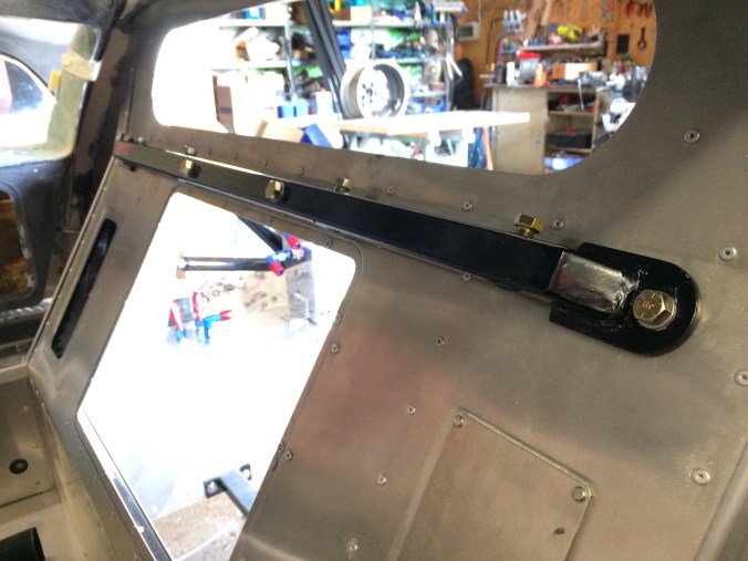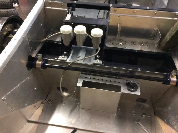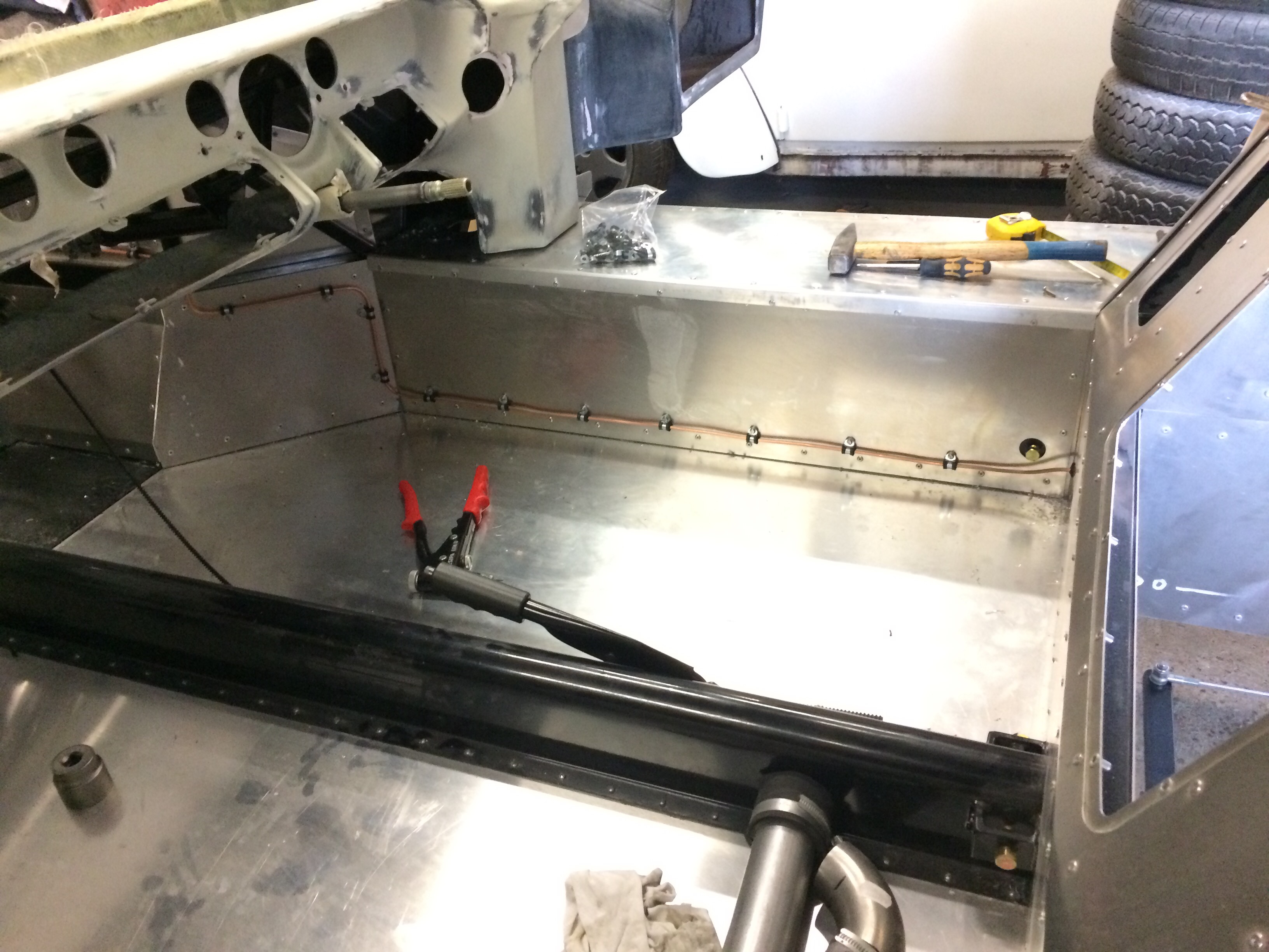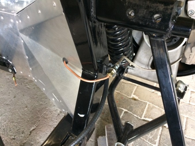 Dies war die nun leichtere Übung; die Verlegung des hinteren Bremskreises die Anspruchsvollere. Der Weg der Leitung geht von der Stirnwand durch die Kabine auf der rechten Seite nach hinten, was der Rennatmosphäre nicht abträglich sein dürfte …