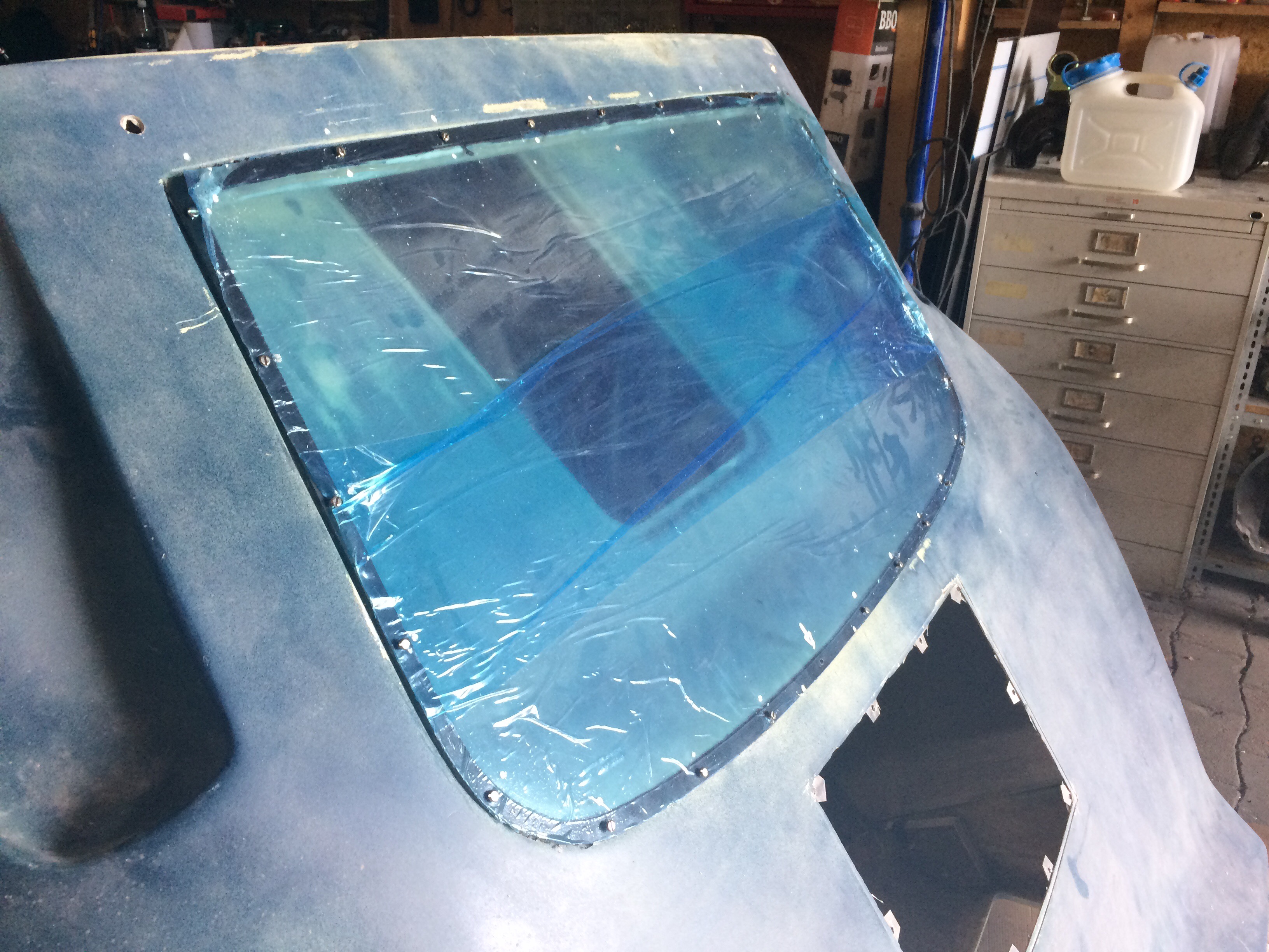 Tja, wer nun erwartet, dass nach drei halben Arbeitstagen SEHR viel am GT40 fertig geworden ist, ist unverbesserlicher Optimist. Der Reihe nach: da die Scheibe für den rear clip schon langsam Patina angesetzt hat, und immer noch nicht angebohrt war, habe ich das am Donnerstag in Angriff genommen. Da die Übung ja schon von den Türscheiben bekannt war, ging das Ganze vergleichsweise reibungsarm über die Bühne. Hier die Scheibe, noch mit Schutzfolie versehen: