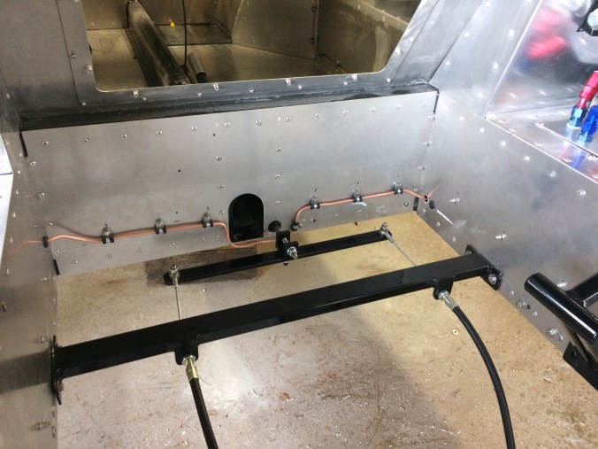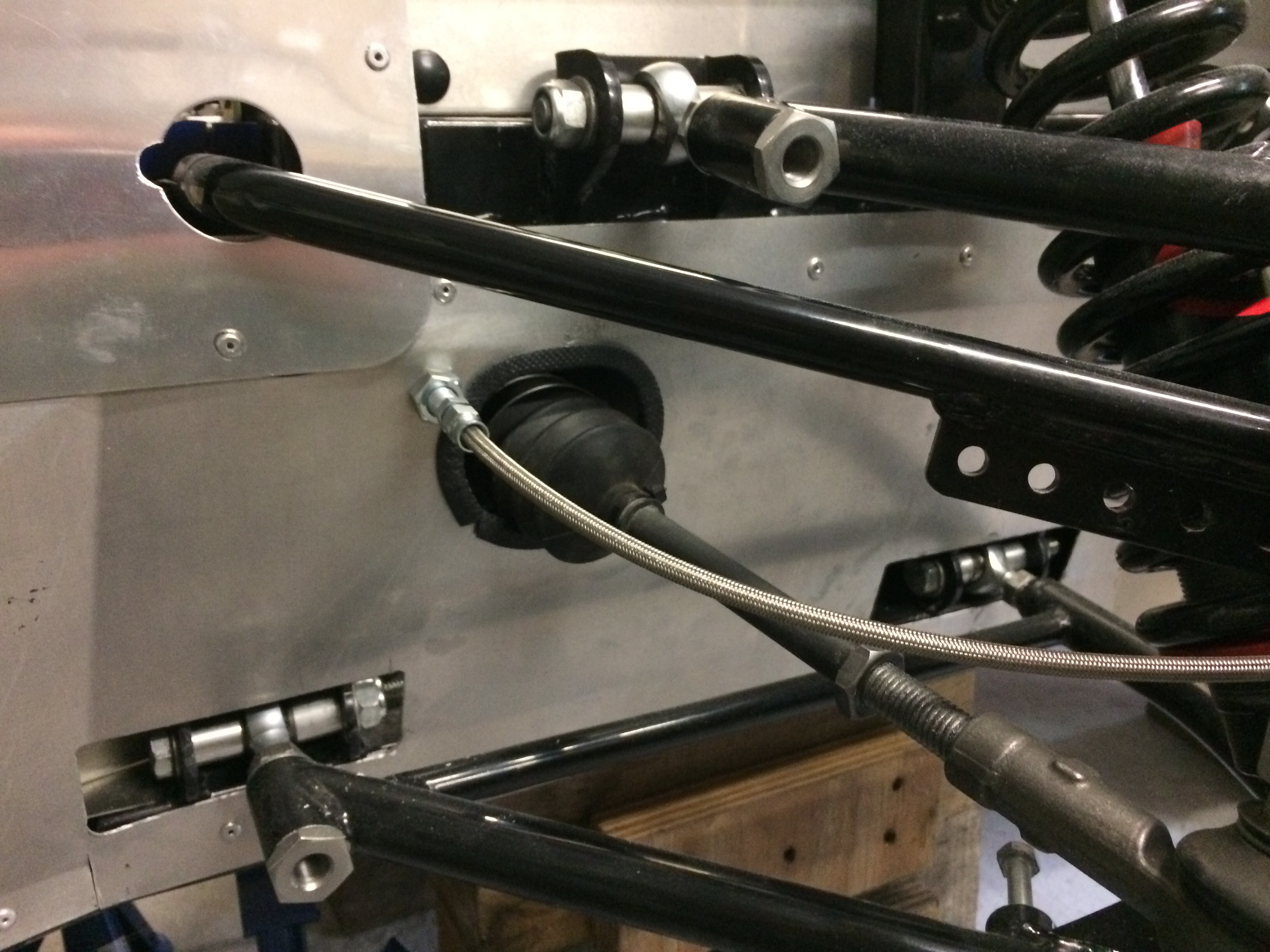 Danach ging es weiter mit den Bremsleitungen zwischen Pedallerie und Bremszylindern. Nur gerade Anbohren, und fertig, theoretisch. Die vorderen Leitungen sollten im Hohlraum vor der Stirnwand verschwinden, über dem die Pedalbox und in dem das Lenkgetriebe wohnt – entsprechend eng geht es dort zu. Am Ende der Arbeiten sieht es nun so aus: