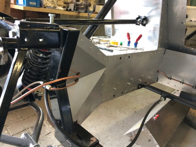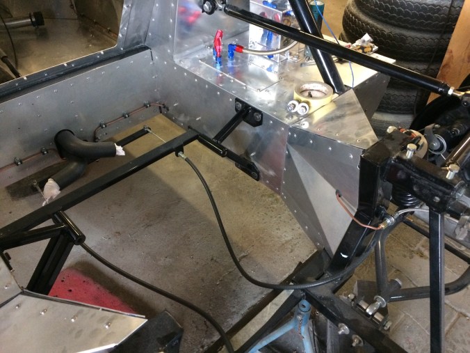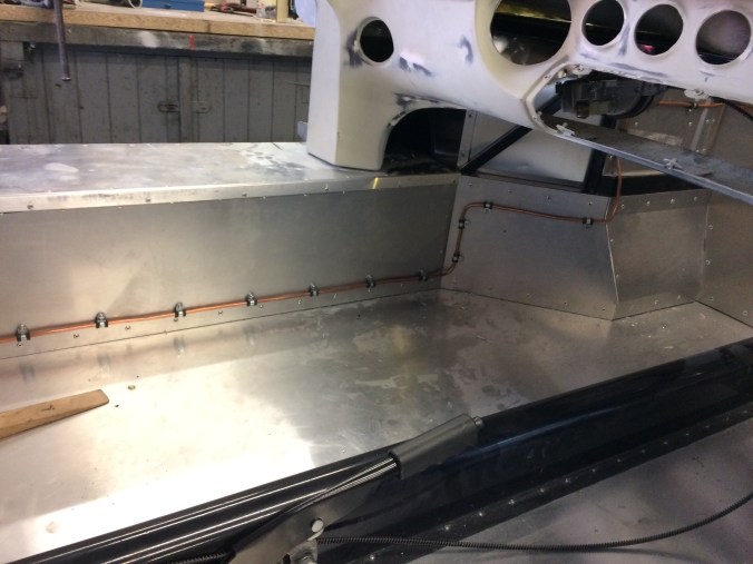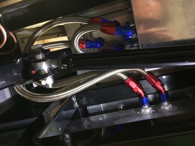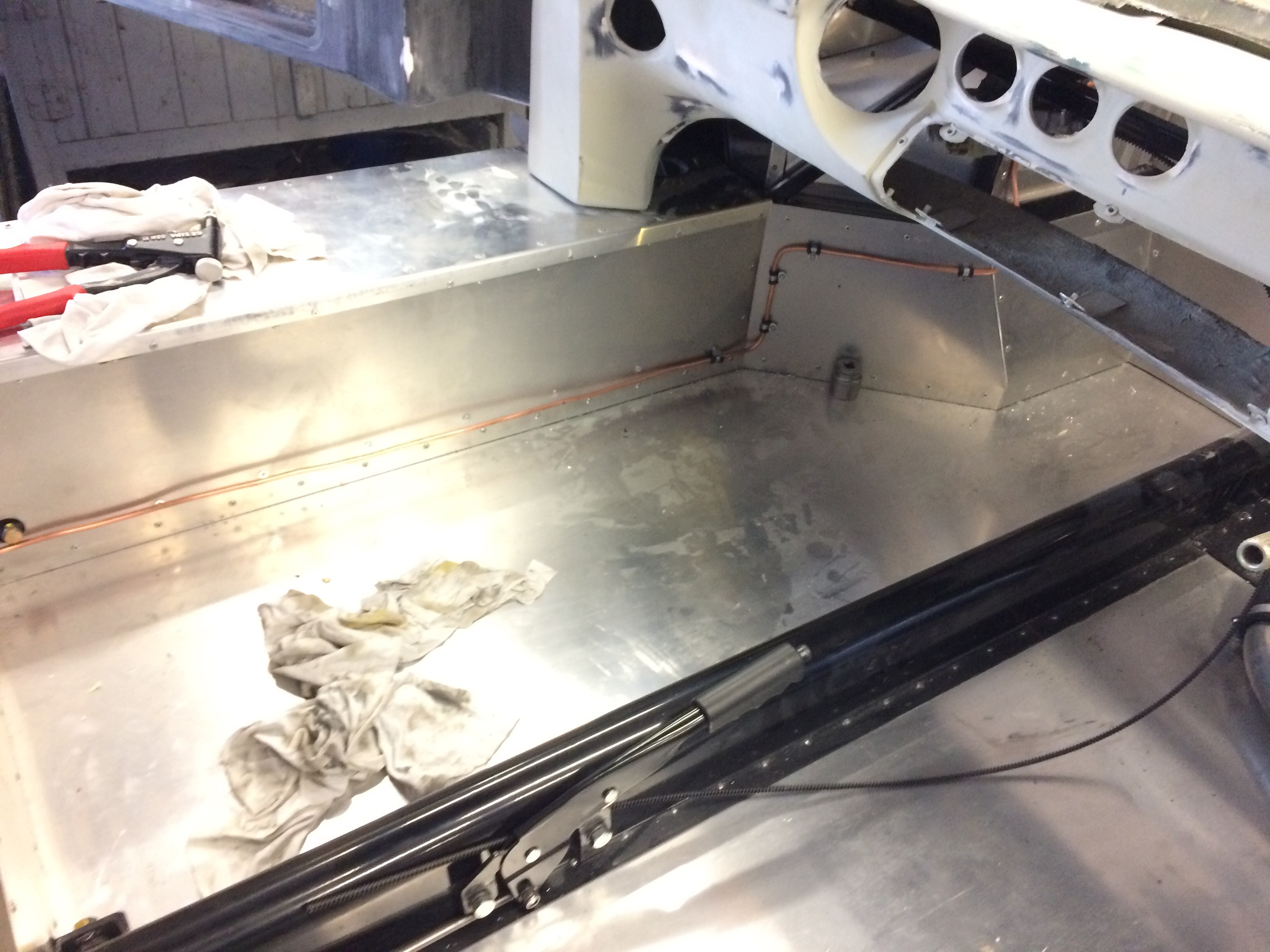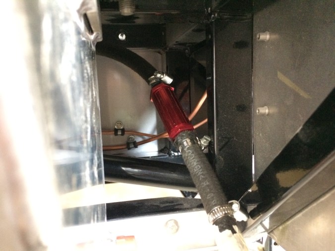 Da das Bild nun nicht zwingend selbsterklärend ist, einige sachdienliche Hinweise an dieser Stelle: das Foto habe ich auf dem Rücken liegend (entspannte Arbeitshaltung übrigens) unterhalb des Schwellers hinten aufgenommen. Ihr erkennt zwei 30 Grad Verschraubungen, die zur Tankentlüftung und -rücklauf auf der rechten Fahrzeugseite dort sind, und die mittels Bulkheadverschraubung nach oben geführt werden. Oben rechts sind noch die beiden elektrischen Anschlüsse der Benzinpumpe erkennbar, und von der Pumpe geht eine weitere Verschraubung zum Catchtank. Ich erwähnt ja bereits, dass der Konstruktion ein gewisses Maß an Komplexität innewohnt. Das wirklich Tragische daran ist, dass von der ganzen technischen Schönheit nichts, aber auch gar nichts, sichtbar sein wird, wenn der GT40 fertig ist (es sei denn, dass ich mich doch noch für Acrylglasdeckel entscheiden werde …). Übrgens habe ich mir weiteren Stahlflexschlauch eines Imitatherstellers von der anderen Seite der Erdkugel bestellt: nicht nachmachen, besser Originales verbauen, soweit mein Ratschlag an die Fachwelt.
