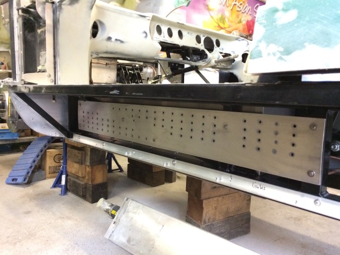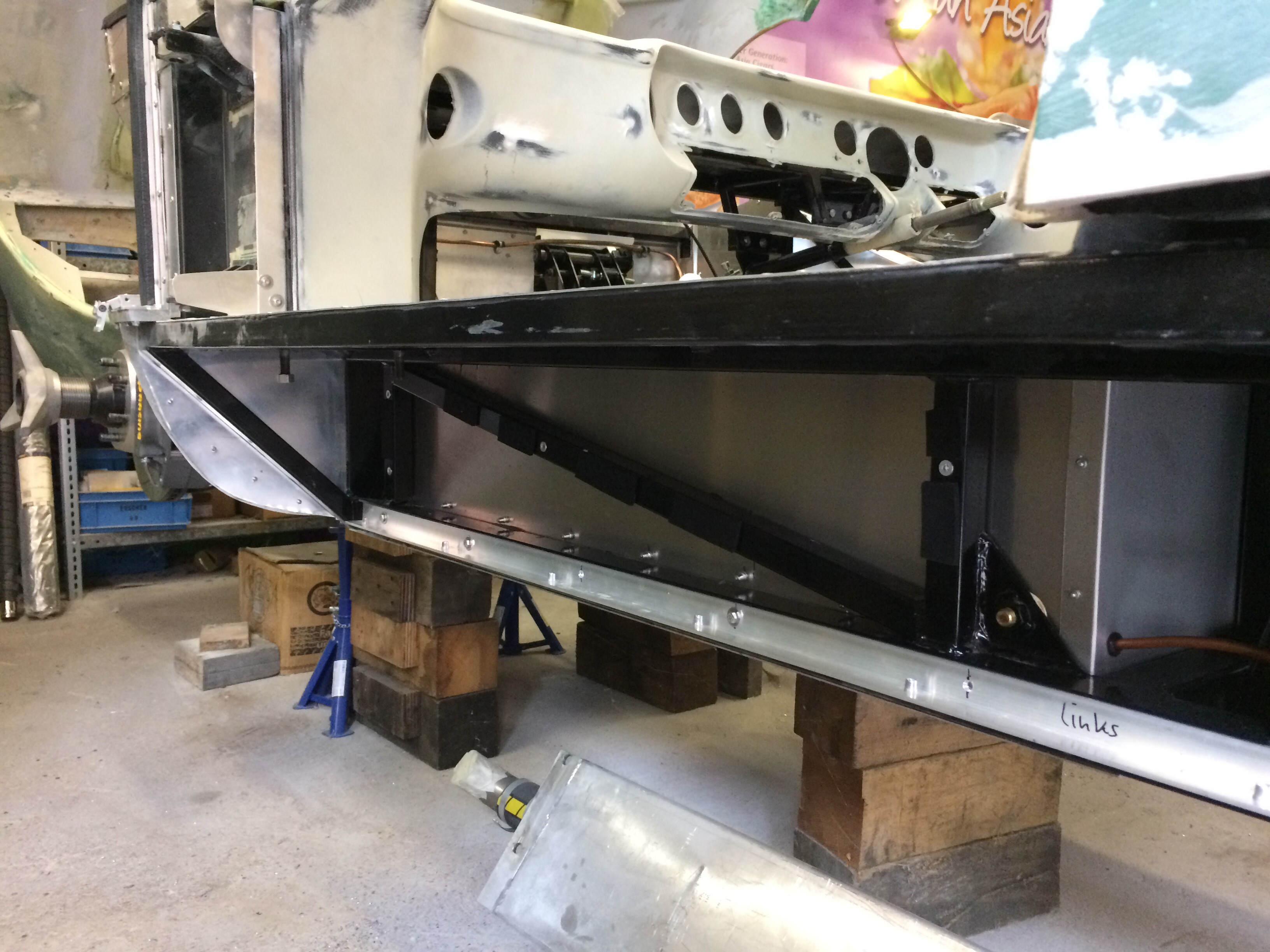 Als nächstes Stand die Anfertigung eines Kabelträgers (sagt man das so?) auf dem Programm, da ein Teil des Kabelbaums ja demnächst von vorn im Auto nach hinten verlegt wird (B wird diesen wichtigen Arbeitsfortschritt interessiert zur Kenntnis nehmen). Da die Seitenbereiche des Fahrzeuges ursprünglich so aussehen …