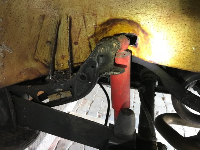 Einen Tag vor meinem Geburtstag (Hinweis) standen diverse Kleinarbeiten an. Die erste betraf den Käfer, da mein Wunsch, die 205/70 R15 Hinterradreifen zu nutzen, beim TÜV nicht auf ungeteilte Freude stiessen. Der Anschlag des Gummipuffers wies einen Abstand zur Felge und zum Reifen von ca. einem Millimeter auf, und der verständige TÜV- Mitarbeiter folge meinem Vorschlag, am Chassis etwas Material zu entfernen: