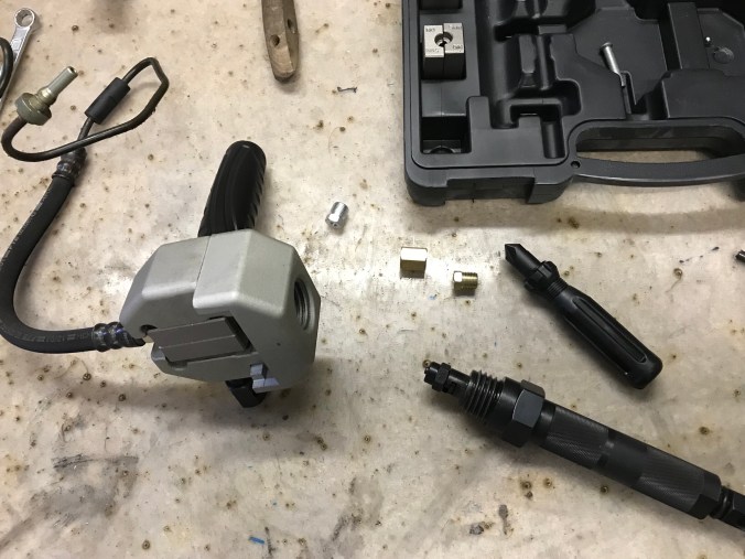 Danach wieder GT40: um die Kupplung zu betätigen, ist die Funktion des Betätigungszylinders zwingend. Das Anschlussding von Audi musste erst einmal gekürzt und dann mit meinem Bördelwerkzeug in Form gebracht werden, etwa so: