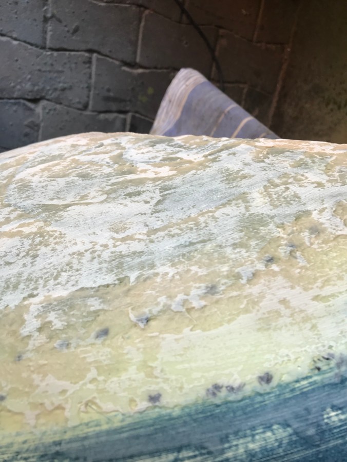 Die Spinne weist aus unerklärlichen Gründen einen Riss an der Türöffnung auf, und diesen galt es zu beheben. Da die Spinne wieder auf der Transportvorrichtung verweilte, konnte ich die betroffene Stelle einfach freischleifen und auflaminieren. Der Grund für den Riss war eine Bohrung, die einer der Vorbesitzer gesetzt hatte, um Innen- und Aussenteil der Spinne mittels Blindniet zu verbinden. Blind ist dabei ein in vielerlei Hinsicht passender Begriff. Hier die Baustelle noch vor dem Laminieren: