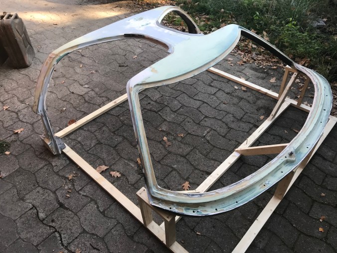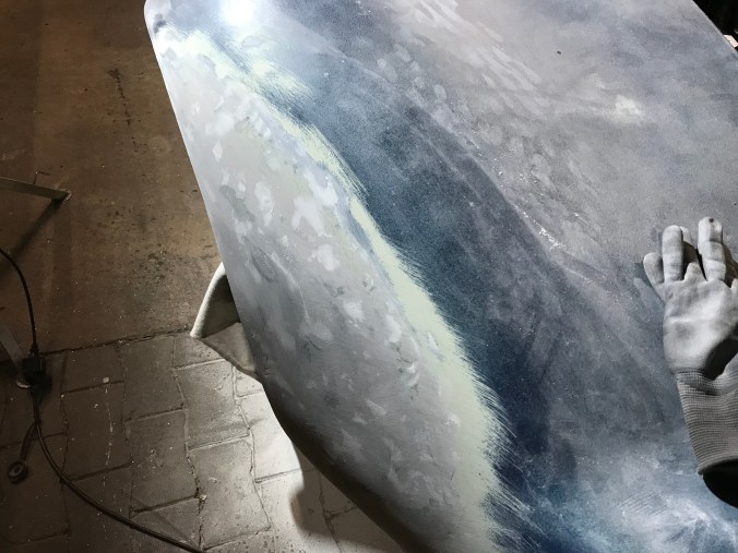 Da es mit der Karosseriearbeit schon mal lief, habe ich die Schleifarbeiten am linken Radhaus des rear clips weitergeführt. Erkennbar ist neben dem dunklen Faserspachtel auch schon der hellere Feinspachtel, was bedeutet, dass auch diese Baustelle nahe an der Fertigstellung steht (zum Glück habe ich noch einen Restbestand 40er Schleifpapiers am Start).