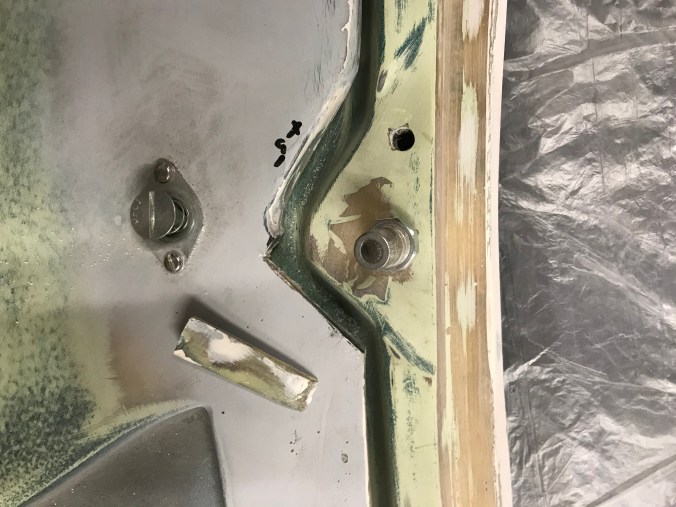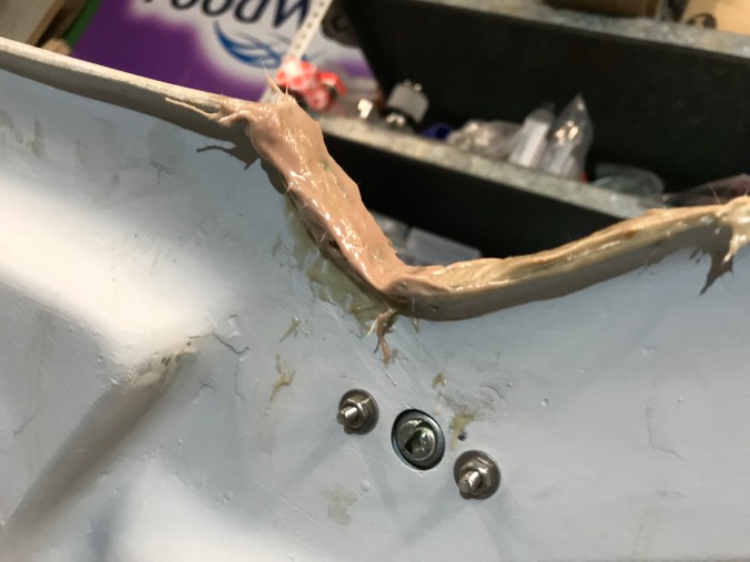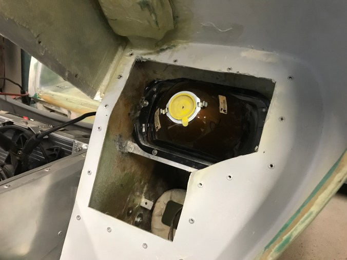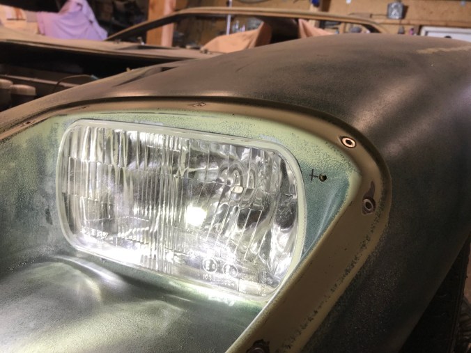 Da noch Zeit war, bis die Gäste eintrafen, habe ich mich nochmals der Scheinwerfer angenommen. Diese hatte ich zwar vor gefühlten fünf Jahren schon einmal mit einer Halterung versehen, aber nicht bedacht, dass die Scheinwerfer ja auch einstellbar sein müssen / sollten. Dazu haben sie eine Verstellschraube, die jedoch im aktuellen Bauzustand vom GfK verdeckt sind. Folgerichtig waren Bohrungen anzubringen, um die Zugänglichkeit herzustellen. Ausserdem hatte ich die Scheinwerferbefestigungen mit Durchgangslöchern versehen, und damals (ich war noch jünger und unerfahrener als heute 😉) hatte ich nicht bedacht, dass meine Finger hinsichtlich Länge, Durchmesser und Beweglichkeit naturgegeben beschränkt sind, mit der Folge, dass die Scheinwerfer nicht wirklich montierbar waren. Abhilfe schaffen Nietmuttern, die allerdings bauartbedingt nicht per Zange, sondern improvisiert mit Schraube, Scheibe und Mutter zu setzen waren.