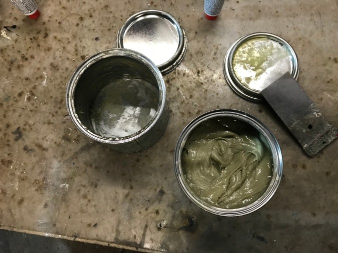 Der Rest des Tages bestand mehr oder weniger in altbekannter Schleif-Spachtel-Schleifarbeit, wobei ich mir, fast am Ziel der Arbeiten am rear clip befindent, schon einmal Sprühspachtel besorgt und aufgetragen habe: