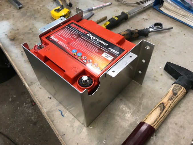 Die Ersatzlösung weist stolze 28Ah auf, und das reicht nachweislich aus (der Motor sprang heute leicht und locker an), um zu funktionieren. Dummer- oder auch natürlicherweise passte die aus Aluminiumblech maßgeschneiderte Batteriehalterung nicht mehr, und so habe ich mit dem Bau einer Neuen begonnen. Hier der Stand kurz vor dem Ausstempeln: