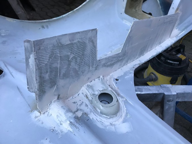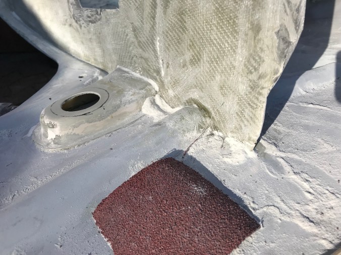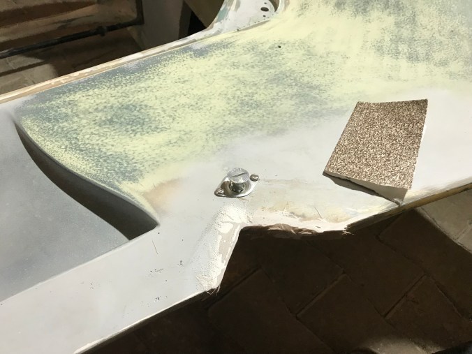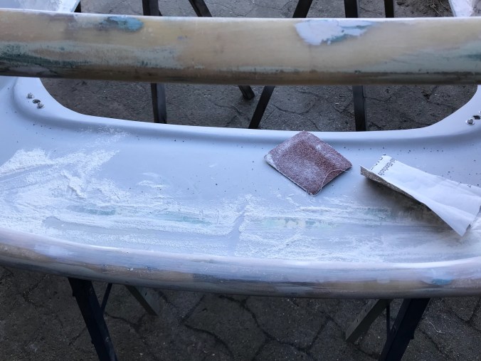 Da nun mit dem rear clip klar Schiff herrscht, habe ich mich zu letzten Feinarbeiten am front clip aufgemacht. In meiner Erinnerung waren die Arbeiten quasi abgeschlossen, und es sollte mit kleinen Detailarbeiten rasch ein Abschluss möglich sein. Die Wahrheit war und ist anders (meine Erinnerung hat mich hier offenbar sehr, sehr getäuscht), und die nächsten Wochen werden „front clip Zeit“ sein. Hier eine Detailaufnahme an der Freimachung für den Scheibenwischer, zusammen mit meinem standardmäßigen 40er Feinschleifpapier: