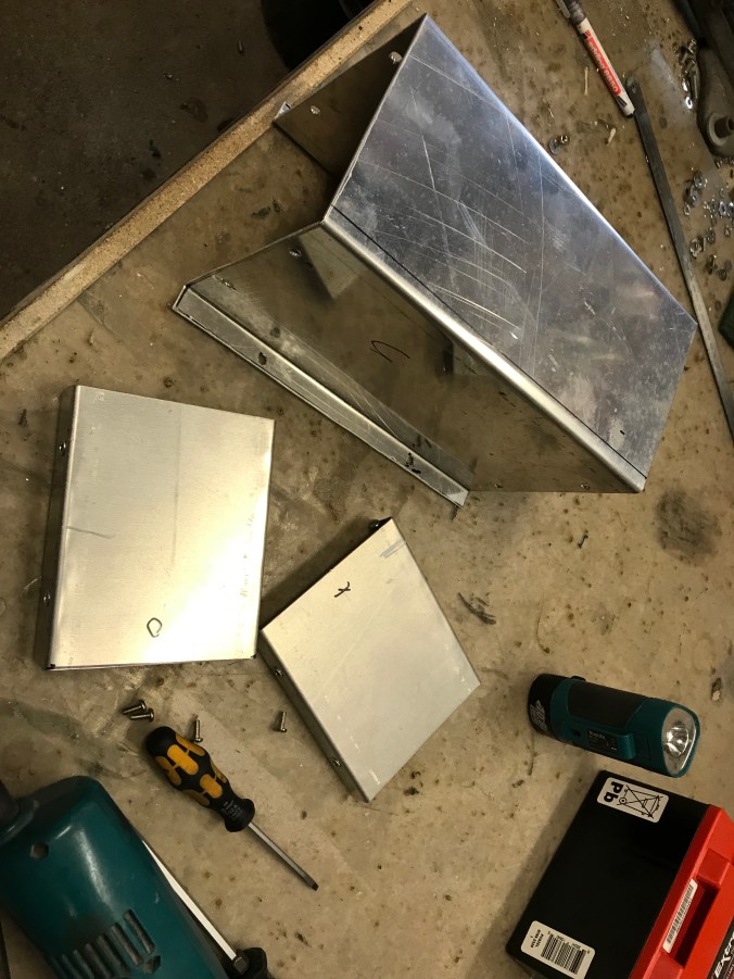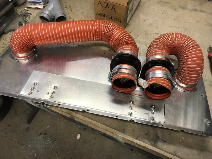 Damit aber noch nicht genug: hier noch eine Darstellung der Lüftungsanlage mit den beiden Lüftern (das oben links wie aus dem Sanitärfachhandel aussehende Teil ist der Abzweig für die Ausströmer seitlich und mittig, die demnächst in die beiden Öffnungen hinter der Lüftern verbaut werden):