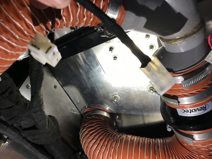 Damit die Dauerbaustelle Cockpit nun endlich geschlossen werden kann, mussten noch die beiden Lüfter angeschlossen werden. Da die dazu notwendigen Kabel aus unerfindlichen Gründen zu kurz geraten sind, habe ich unter Aufbringung aller meiner elektrischen Fähigkeiten eine Verlängerung gebaut, in der oberen Bildmitte erkennbar (und im Fußraum liegend fotografiert):