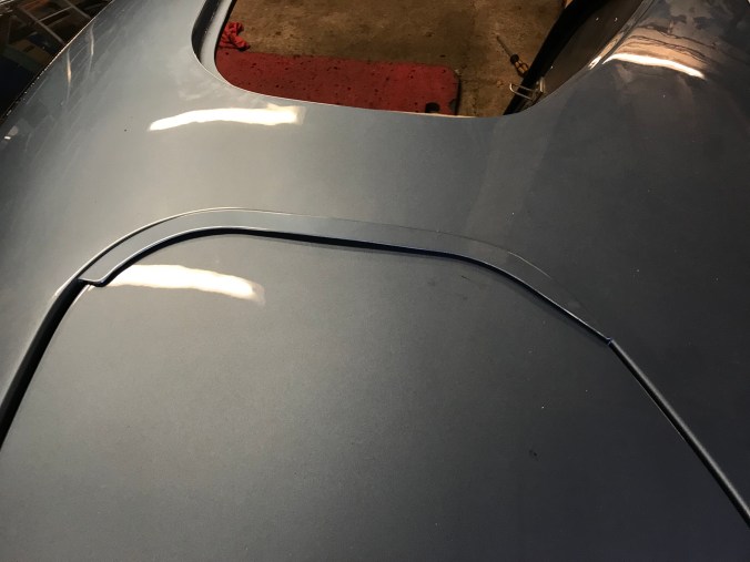 Das läßt sich bei aller Phantasie und beim allerbesten Willen nicht mehr als „60er Jahre Rennwagen“ verkaufen. Ergo habe ich die Tür, frisch lackiert, im unteren Bereich zurückgeschliffen, und auch noch zwei weitere zu groß geratene Bereiche verkleinert. Die Tür werde ich am Montag im Morgengrauen zu R in die Lackierwerkstatt tragen, und dann ganz, ganz schnell verschwinden.