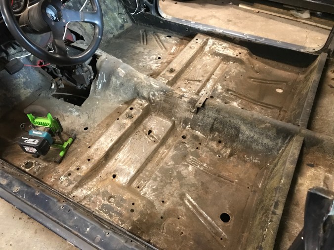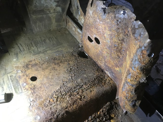 Der Blechdoppler rechts war partiell durchrostet, und unter dem Querträger haben sich viele interessante Korrosionspartikel angesammelt. Damit musste der Blechdoppler weichen (Gewicht, Gewicht), und der darunter durchgerostete Boden leider ebenfalls. Nach Entfernen allen Unrats dann der überarbeitete Zustand hier erkennbar: