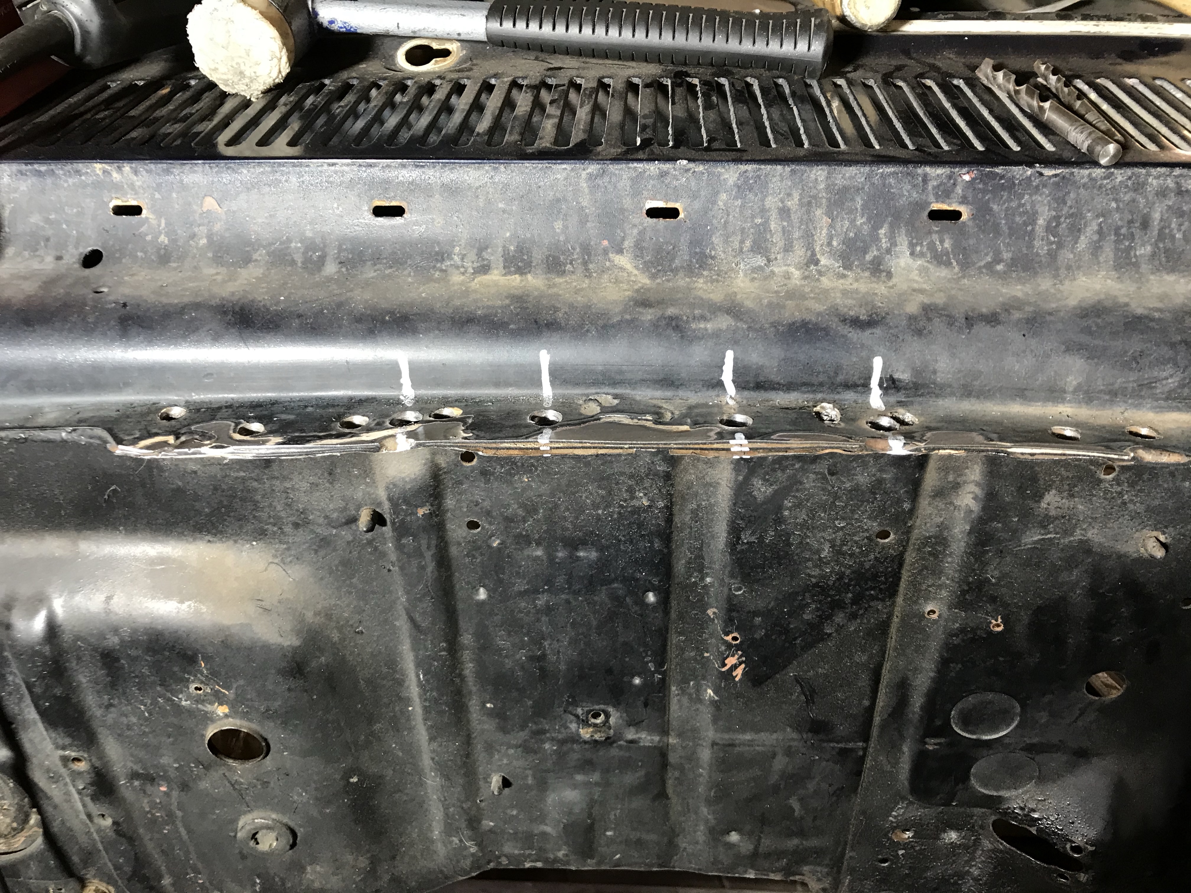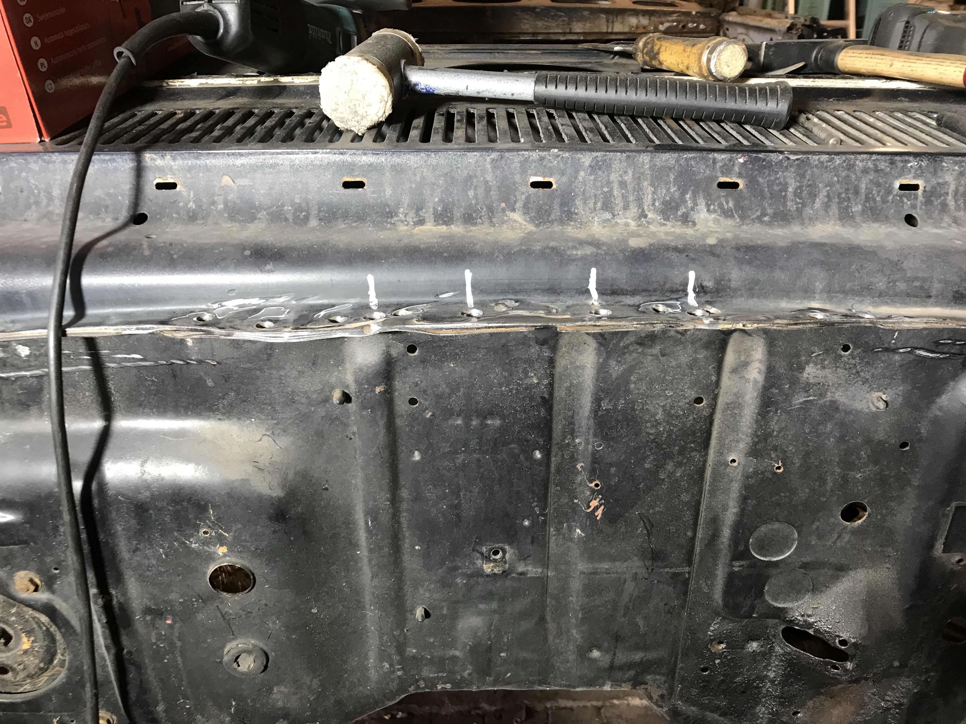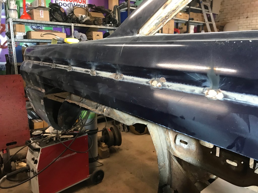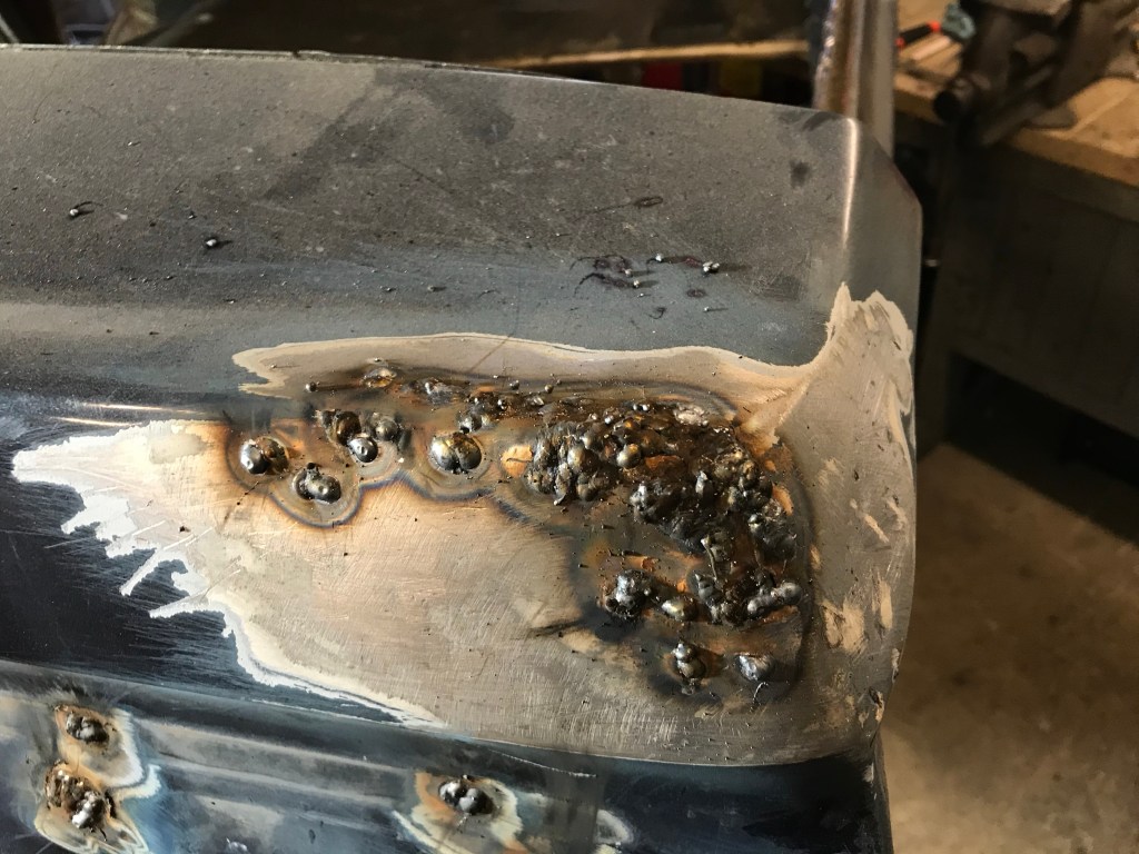Nach so viel Biegen und Blechstrecken konnte ich noch Restmotivation für das Zuschweissen der Befestigungsdurchbrüche der Zierleisten auf der linken Seite aufbringen. Wie erinnern uns, dass auf dieser Seite hinten die hässlichen Löcher warten, die jemand zur Befestigung der Spachtelmasse in die Karosserie gebohrt hat. Nach erstem Schweissen dieses Ergebnis: