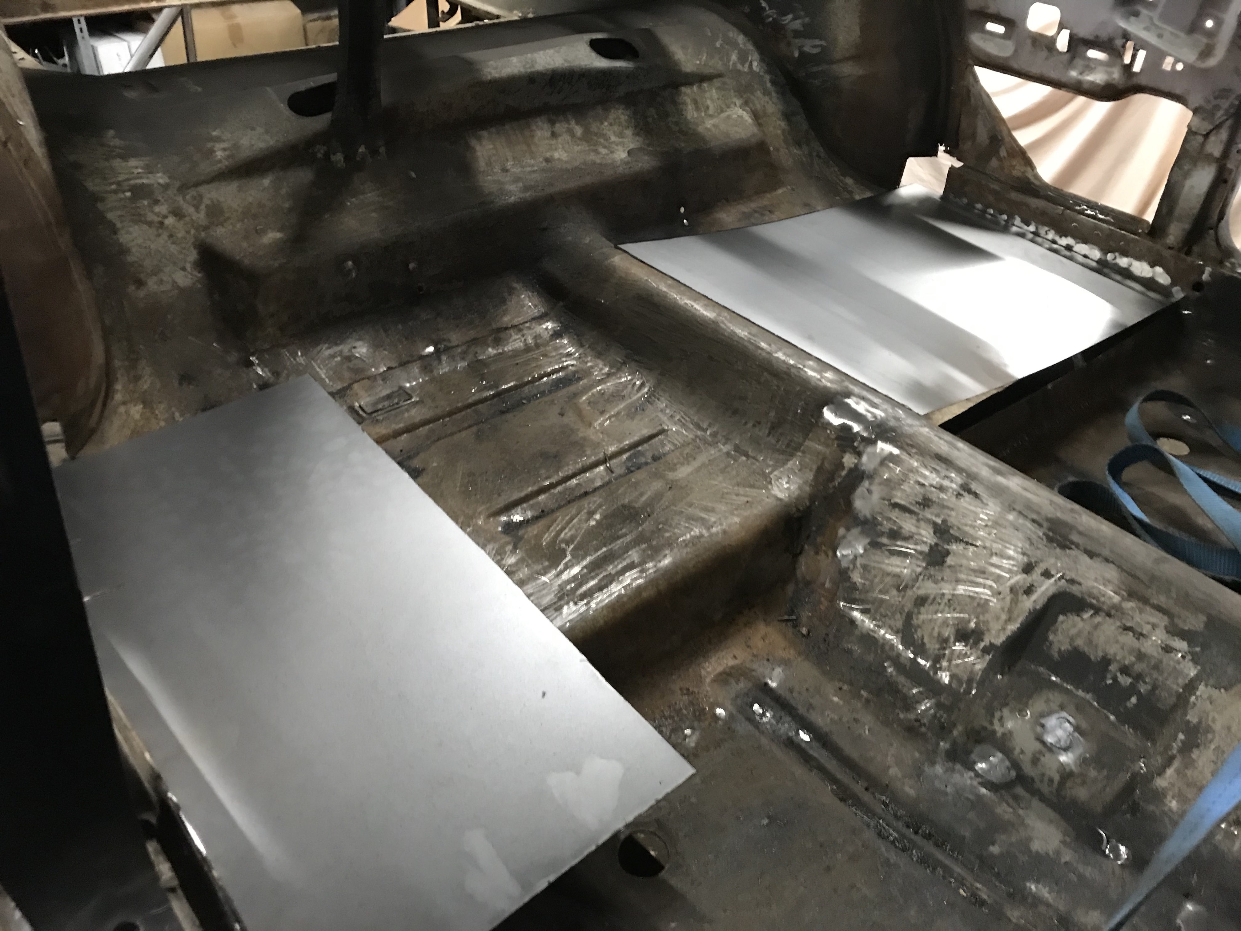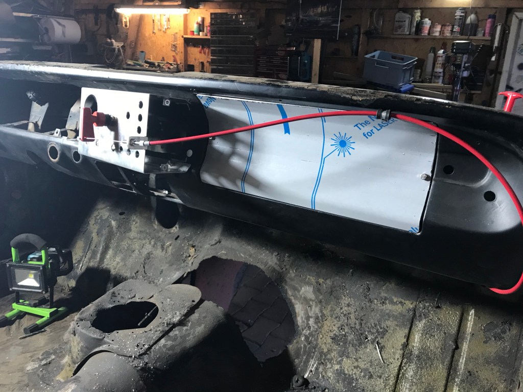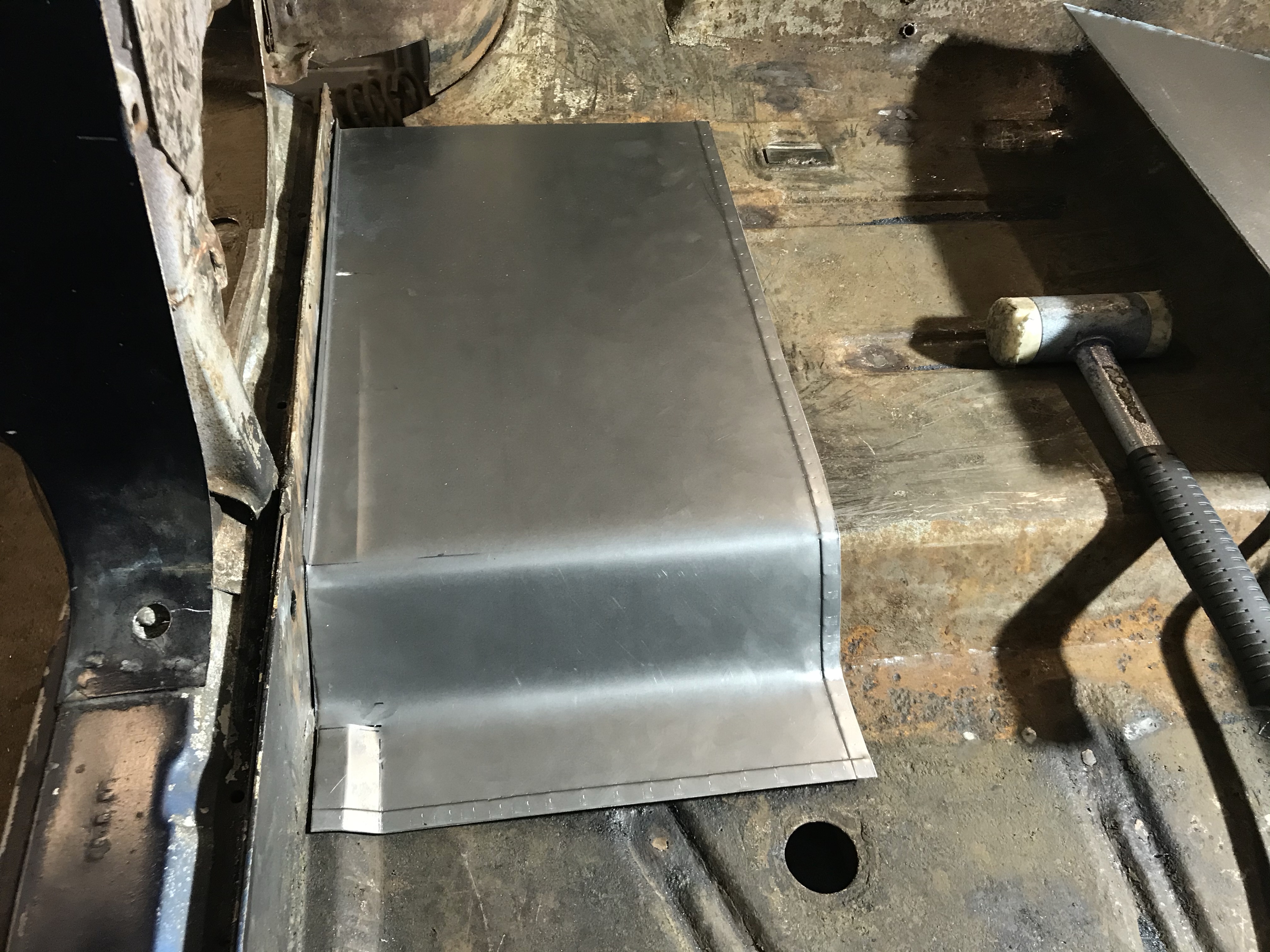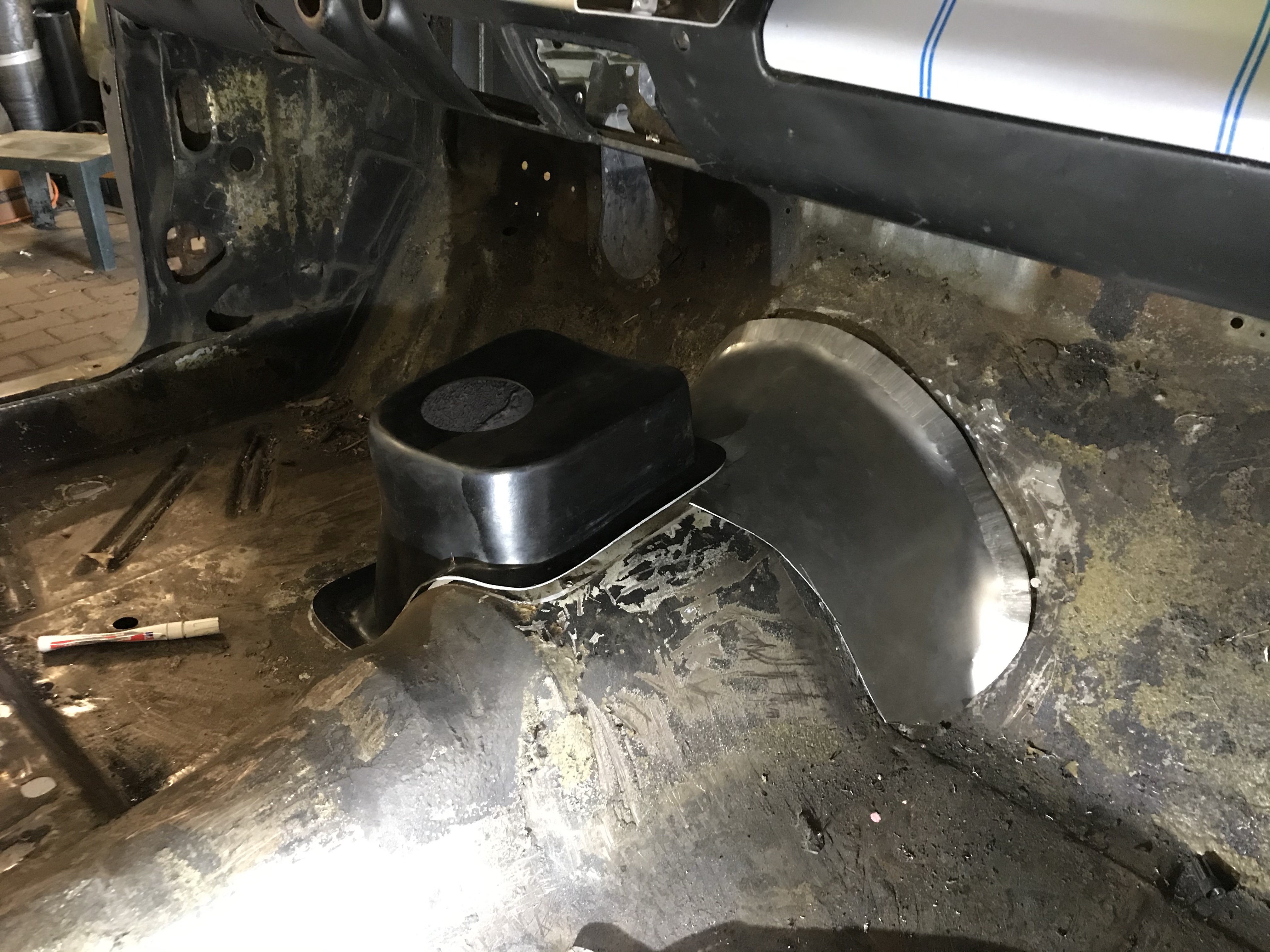 Um mit weniger Aufwand weiter zu kommen, habe ich das Streck-Stauchblechwerkzeug, dass N freundlicherweise mitgebracht hat, zum Einsatz gebracht, um die Bodenöffnung über dem Getriebe zu schliessen. Zusammen mit der nachgelieferten GfK-Abdeckung sieht die Baustelle so aus: