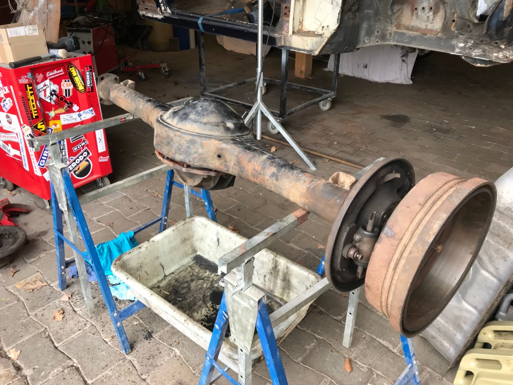 Während der vergangenen Woche habe ich dann nachgeschaut, wie die Hinterachse demontiert wird. Hier ein Bild auf dem Weg dahin …