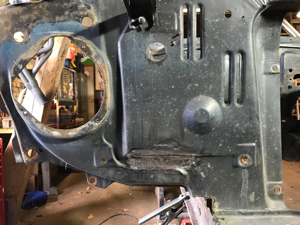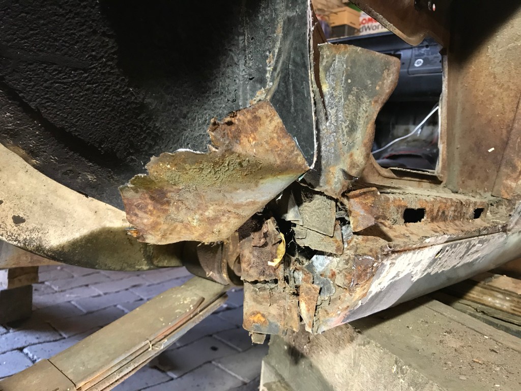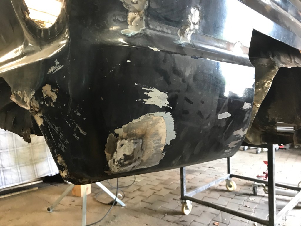 Einige zunächst übersehene Löcher im Boden habe ich dann noch schweisstechnisch geschlossen (man kann auch sagen: zugeschweisst), um mich dann an die Wiederherstellung der Schweller hinten zu machen. Wir erinnern uns: einer der Voreigentümer hatte neue Radkästen für Monsterräder eingesetzt, und dabei die Enden der Schweller verstümmelt.