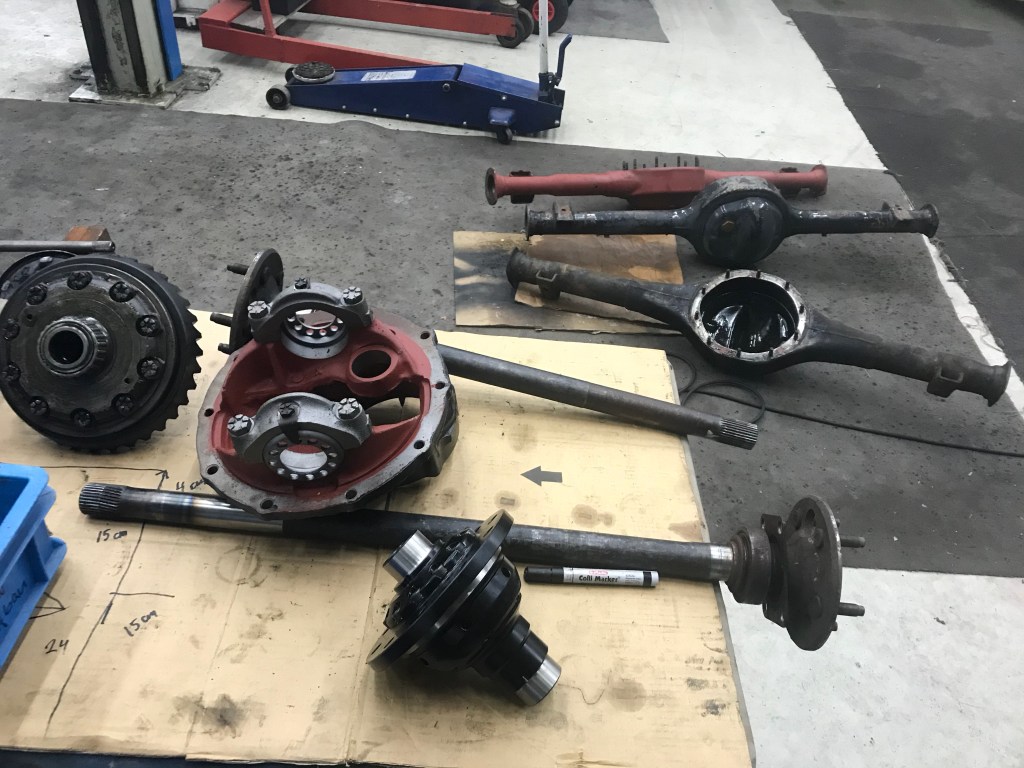 Meine Hinterachse ist zu breit, die Antriebswellen sind verschlissen, und die Übersetzung ist zu kurz. Immerhin verfügt die Achse über ein Differential, vorne im Bild eine Rennsportausführung. Wenn das Budget nicht wär 🤷♂️.