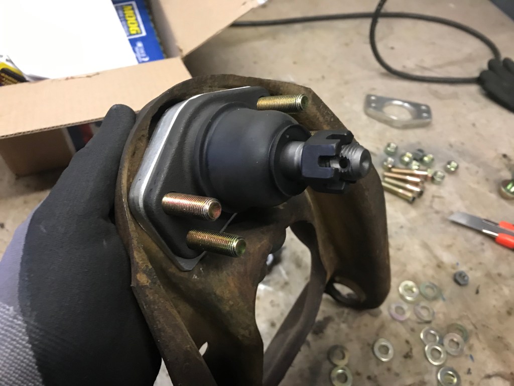 Per Post aus U.S.A. kam das „wedge kit“ für den oberen Querlenker. Interessanterweise mussten sowohl Querlenker als auch ball joint auf 3/8“ aufgebohrt werden, aber nun steht der ball joint trotz Tieferlegung perfekt im Winkel: