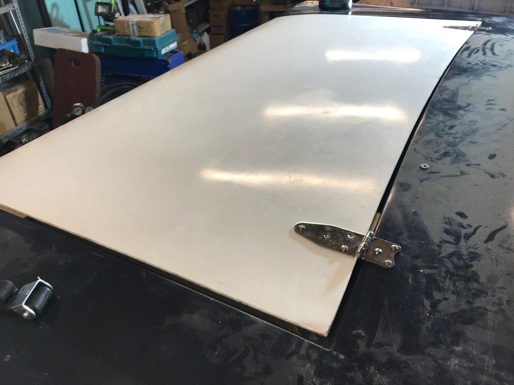 Die Scharniere sind dieselben wie die am Kofferraumdeckel, seeeehr leicht. Da gemäß FIA die Verriegelung der Hauben anzupassen ist, hatte ich im Vorfeld Haubenhalter gekauft, und nun montiert: