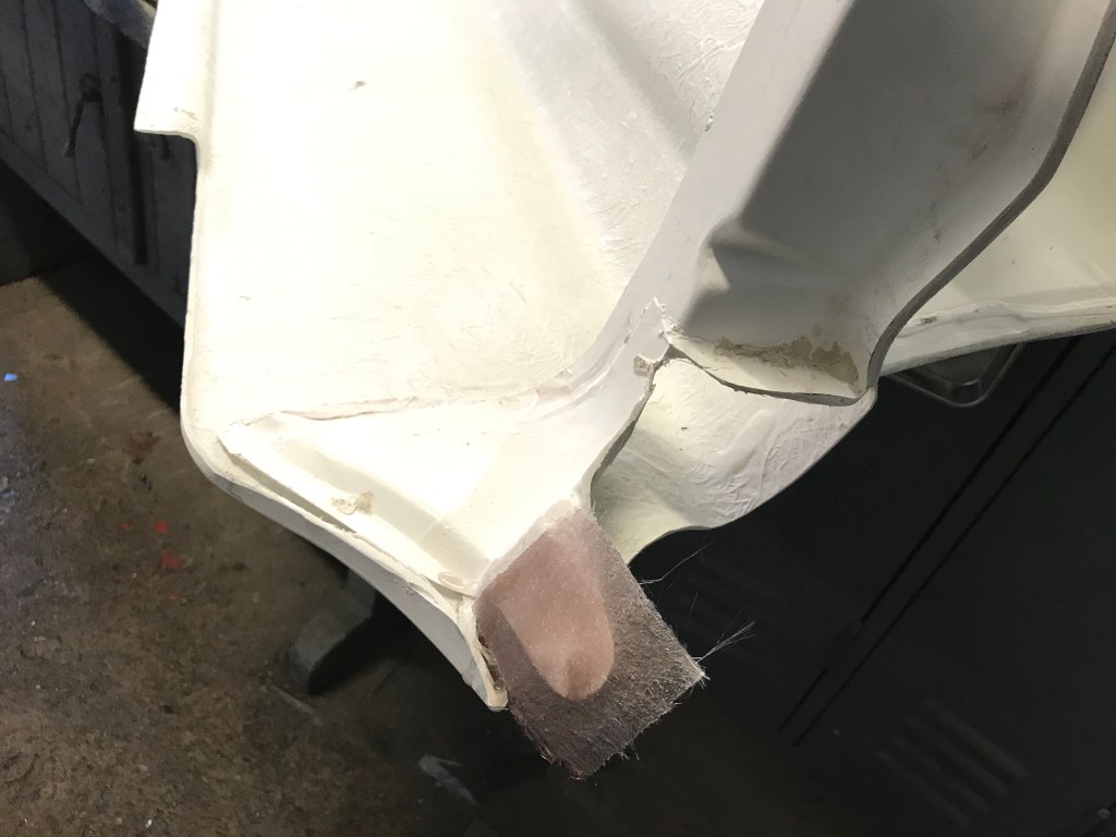 Die vorderen Kotflügel (komisches Wort übrigens, fender klingt besser), ebenfalls aus Kunststoff, stammen zwar nicht aus den 1980ern, sind aber qualitativ gut getarnt, das Jahr 2020 betreffend. Sämtliche Anschraubstellen sind sowohl geometrisch deplaziert und obendrein noch zu klein ausgeführt. Überraschenderweise habe ich aber vom GT40 noch Harz, Härter, Pinsel und Fasermatten im Regal, und habe der lange zurückliegenden Tätigkeit des Anlaminierens gefrönt: