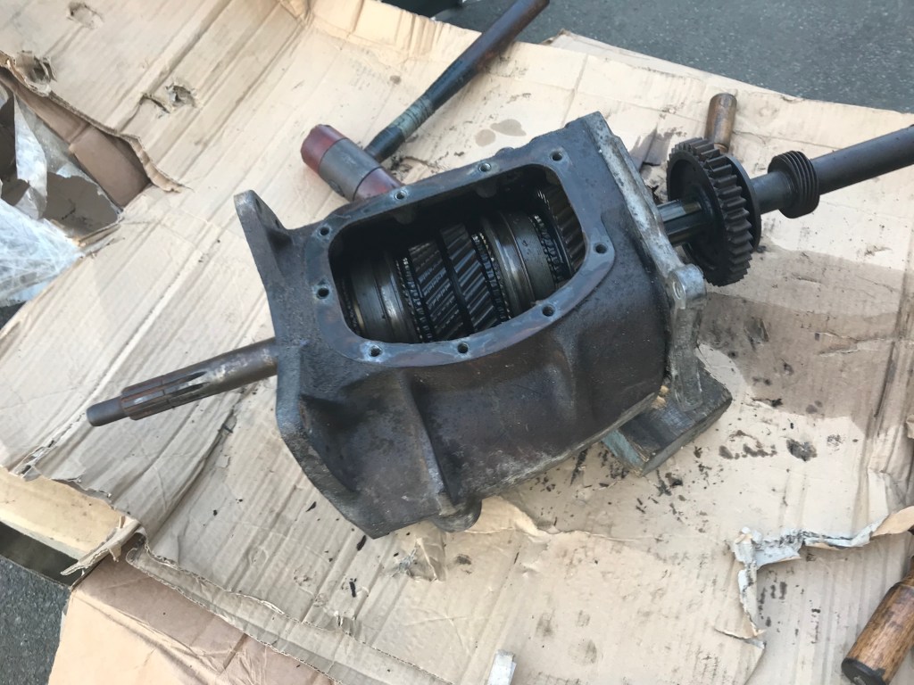 Soeweit sieht alles ganz brauchbar aus, die Zahnräder scheinen OK, das Gehäuse rissfrei. Der einzige Wermutstropfen ist, dass die Abtriebswelle nur 25 splines aufweist, und daher „prone to breakage“ ist, und konsequenterweise gegen eine 28 spline Variante ersetzt werden muss. Es hätte schlimmer kommen können 😁