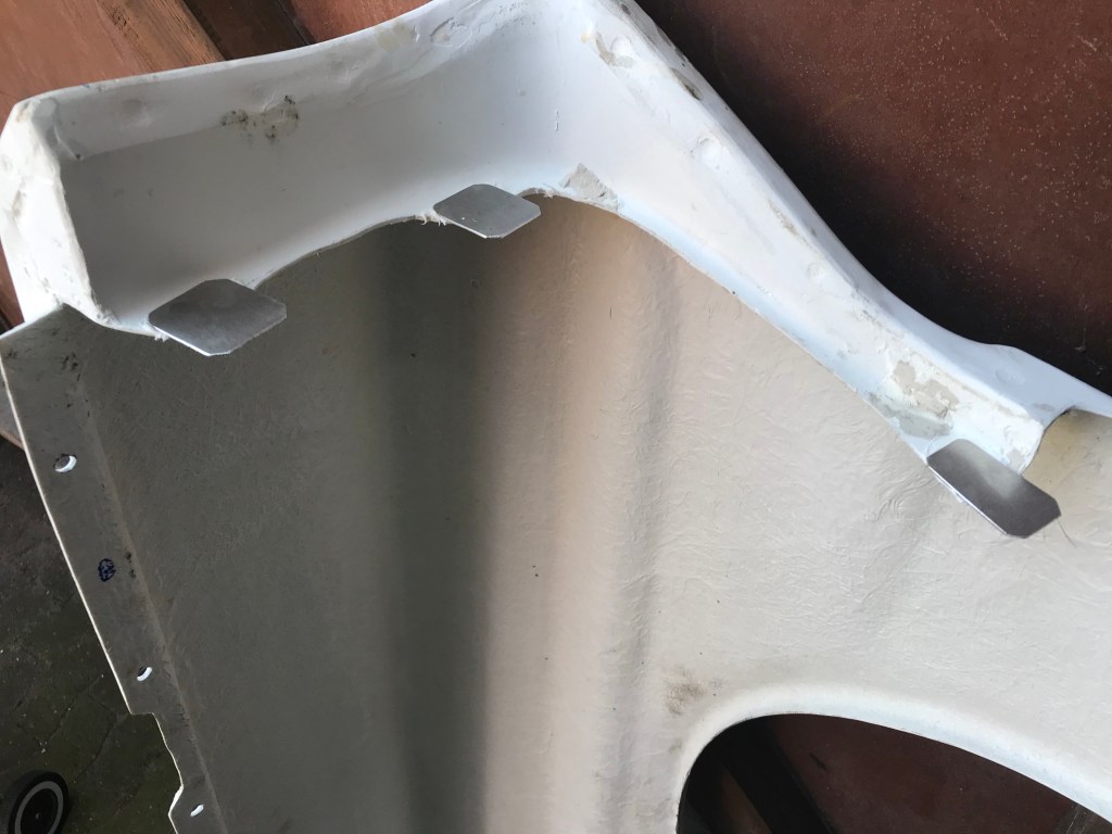 Die blauen Pfeile auf dem weissen fender zeigen an, wo Material fehlt. No comment any more. Ich habe dann drei Aluminiumbleche zurecht geschnitten, diese mit dem fender verklebt …