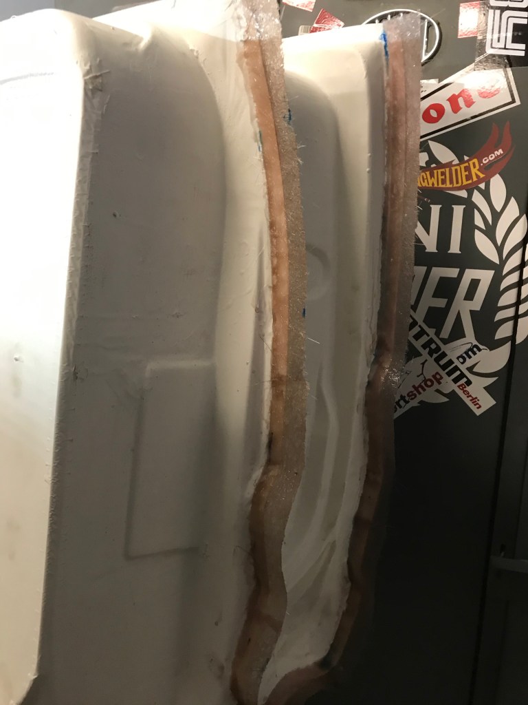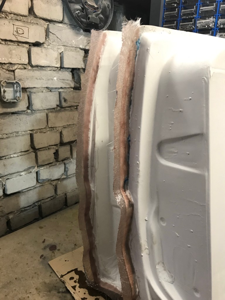 Das durchwachsene Wetter habe ich genutzt, und ein paar Stunden mit wichtigen Dingen am Falcon verbracht. Noch frisch ist die Erinnerung an die Türen, die ich mit einem schmalen Streifen Glasfasermatte vorn und hinten (leider sind beide Seiten zu kurz, wenn schon, denn schon) dimensionell erweitert habe. Hier die eine Seite mit Streifen …