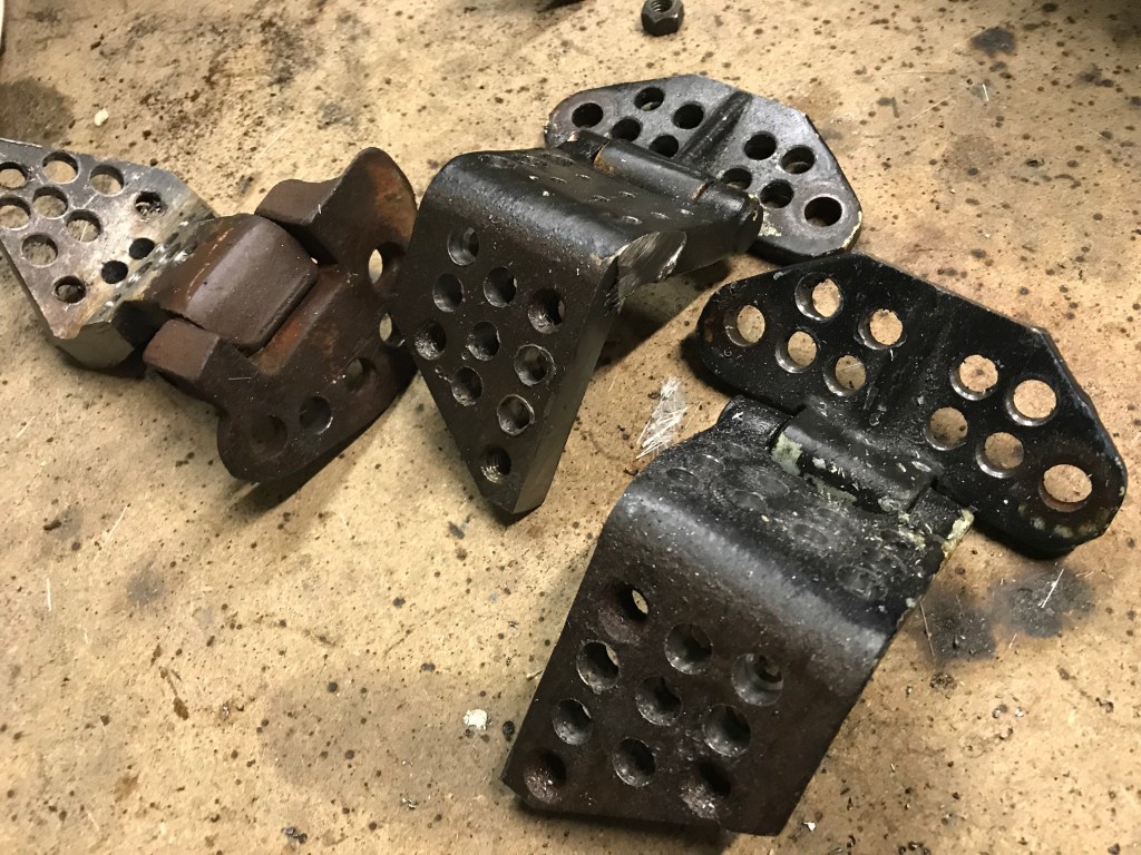 Da das Laminat an den fendern noch trocknen musste, habe ich mich wieder mit den Türscharnieren beschäftigt. Deren Dimension ist, bei Berücksichtigung des festgestellten Türgewichtes immer noch konservativ bemessen, für die Sauerkrauttüren allerdings lächerlich zu massiv. Also stand wieder Diät auf der Agenda, hier zwei der Patienten nach erfolgten Leichtbaumaßnahmen: