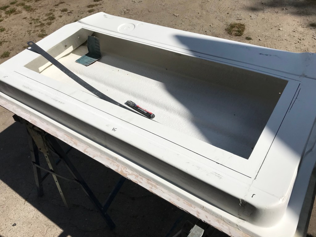 An der Türinnenseite ist zwar geometrisch nichts auszusetzen, jedoch läßt die Oberflächenqualität wieder craftmanship vermissen. Da als Innenverkleidung ein Aluminiumblech Verwendung finden soll, habe ich die Imperfektionen, soweit möglich, entfernt, so dass die Aluminiumbleche etwas größer als vorgesehen werden, ich aber dafür weniger nachbessern muss (vereinfacht ausgedrückt habe ich soviel Unschönes entfernt, wie es eben geht):