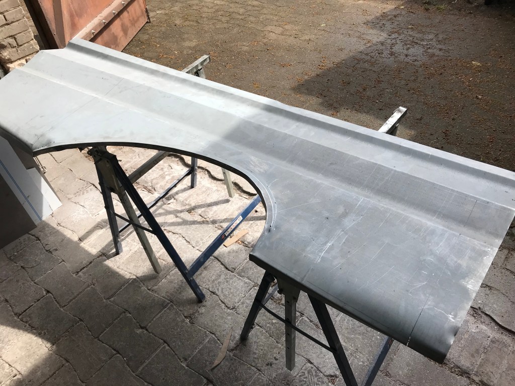 Die Kür des heutigen Bautages allerdings bestand in der Anfertigung des Dachreparaturbleches hinten links. Die Aufgabenstellung bestand in der Anfertigung eines doppelt gekrümmten, z-förmiges Profiles, hier zu sehen: