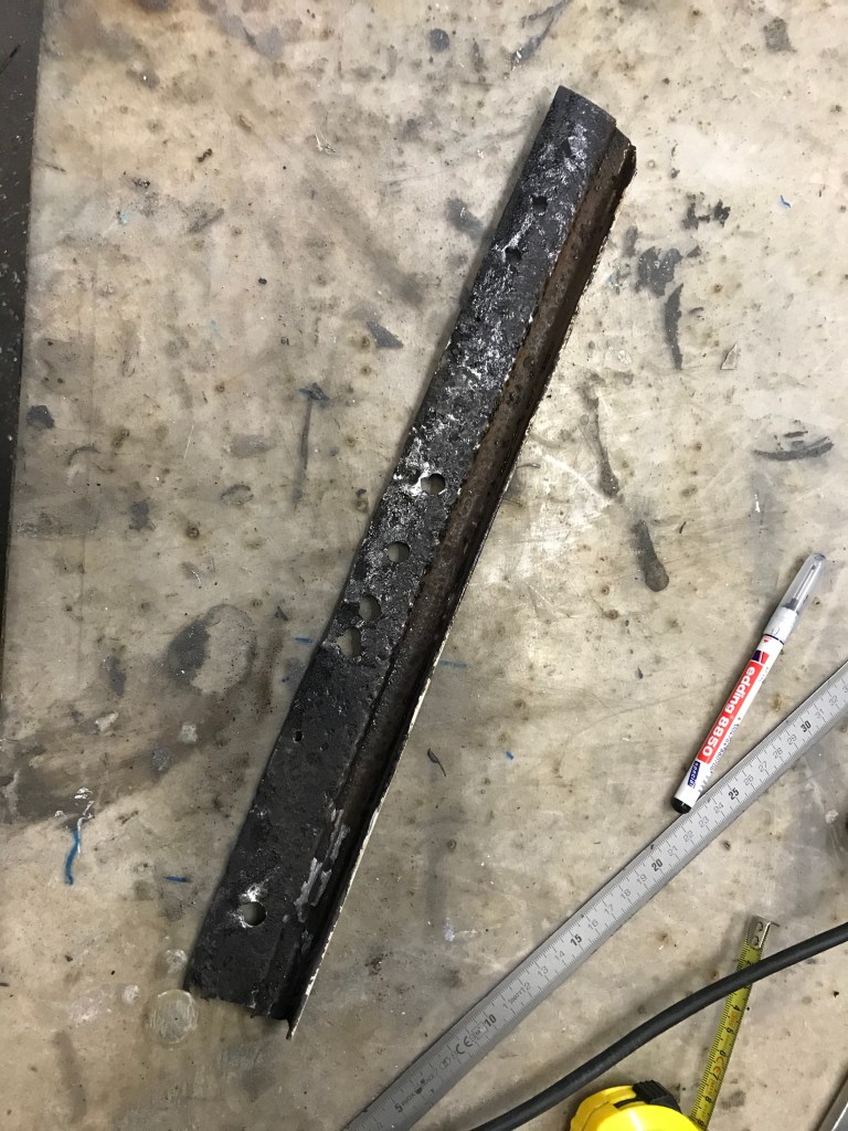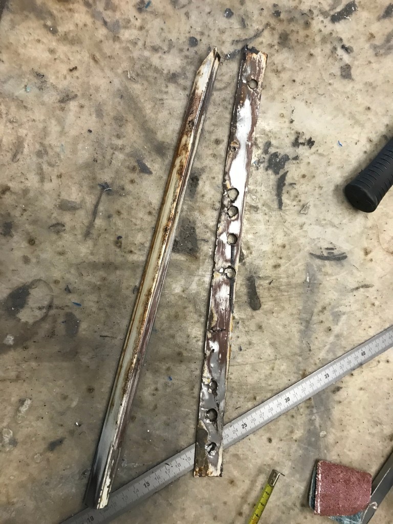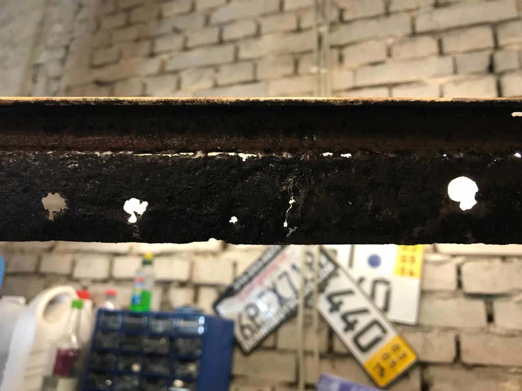 Das linke Winkelstück (die Regenrinne) ist derzeit mit Korrosionsumwandler in Behandlung – es wird blanker Stahl zurückbleiben, hoffentlich ohne allzuviele Löcher 🧀. Das rechte Stück habe ich in die Rubrik „Museum“ verfrachtet, eventuell werde ich es aber auch dem Wertstoffkreislauf zur Verfügung stellen.