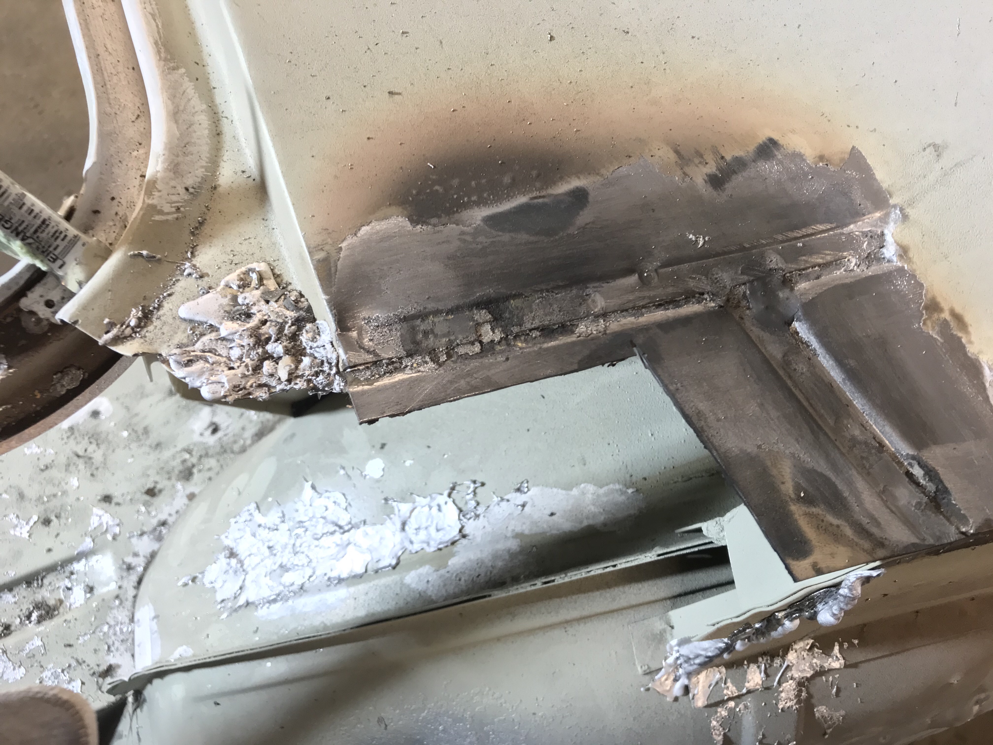 Damit aber nicht genug: per Autogenbrenner konnte ich das Zinn auf der rechten Seite hinten ebenfalls aufschmelzen und weitestgehend entsorgen (das Zeug ist deutlich schwerer als Spachtelmasse), und kann die Stahlbleche demnächst mit den Reparaturblechen fügen.