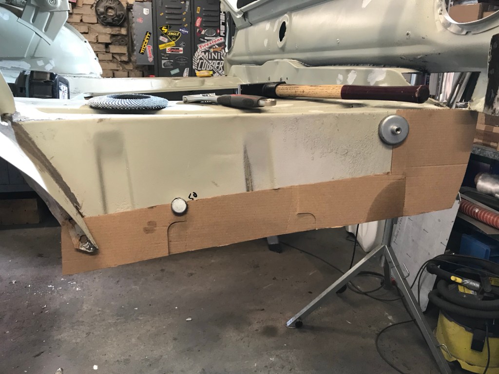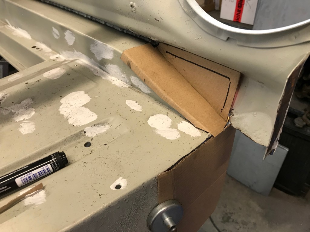Vor dem Einschweissen der rear quarters habe ich dann noch Pappschablonen für die hinteren unteren Seitenteilbleche innen ausgeschnitten, um diese dann später auf Stahlblech zu übertragen: