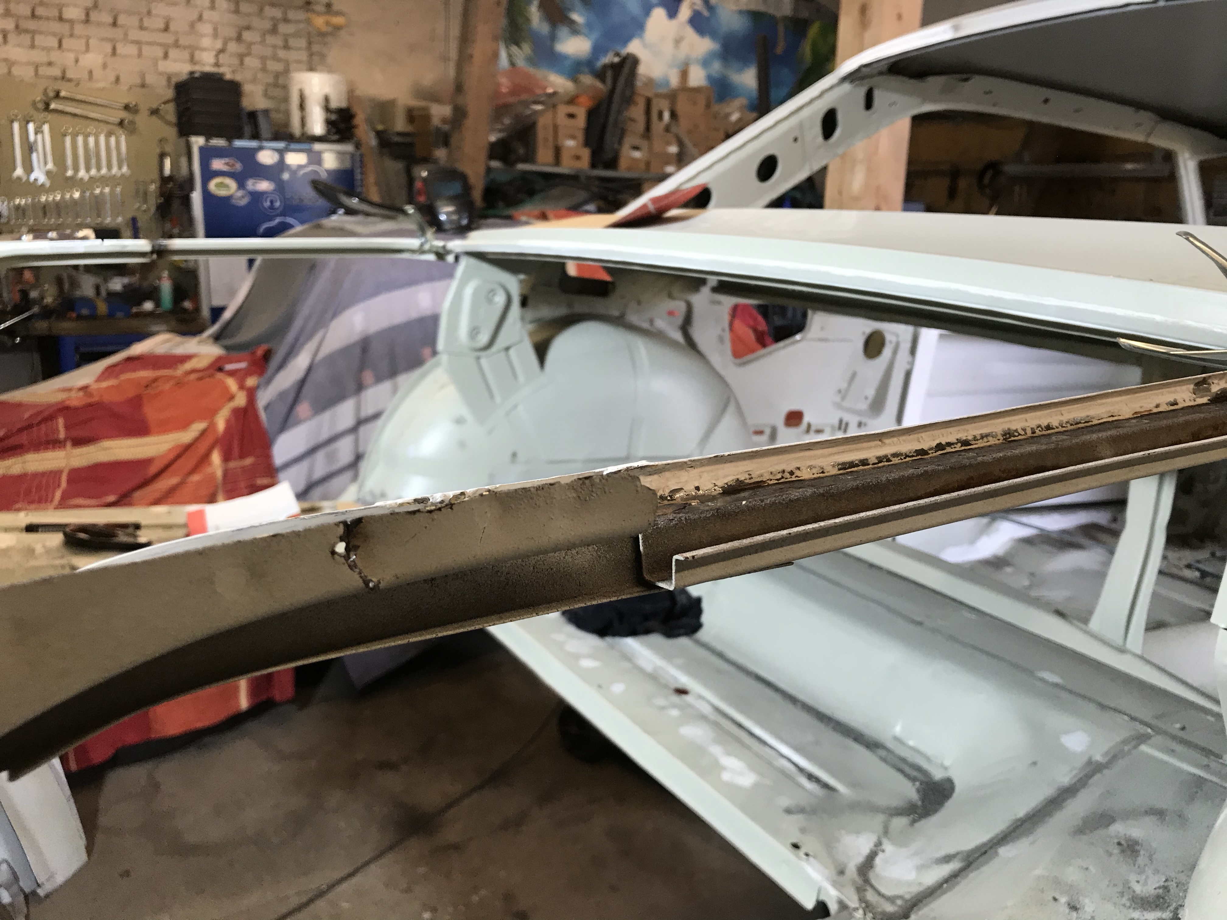 Um nun die rechte Seite annähernd fertig zu stellen (immerhin ist das RH Reparaturblech noch im Transit), habe ich die Reste der C-Säulenanbindung mit dem Seitenteil entfernt (wir erkennen die Situation von der linken Seite spielend / spiegelnd wieder):