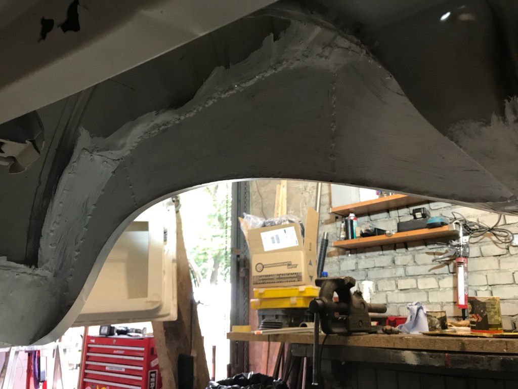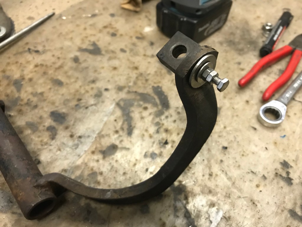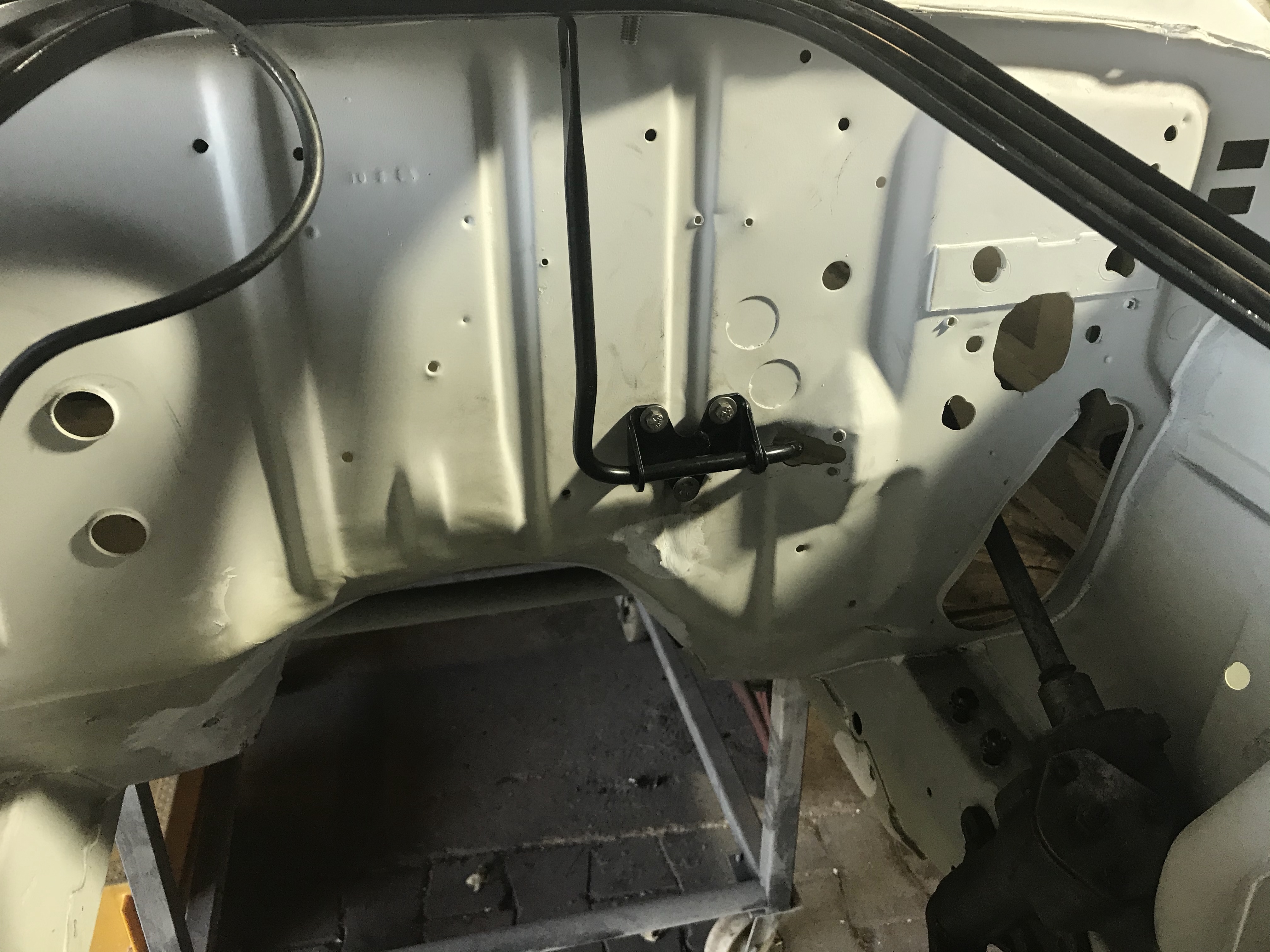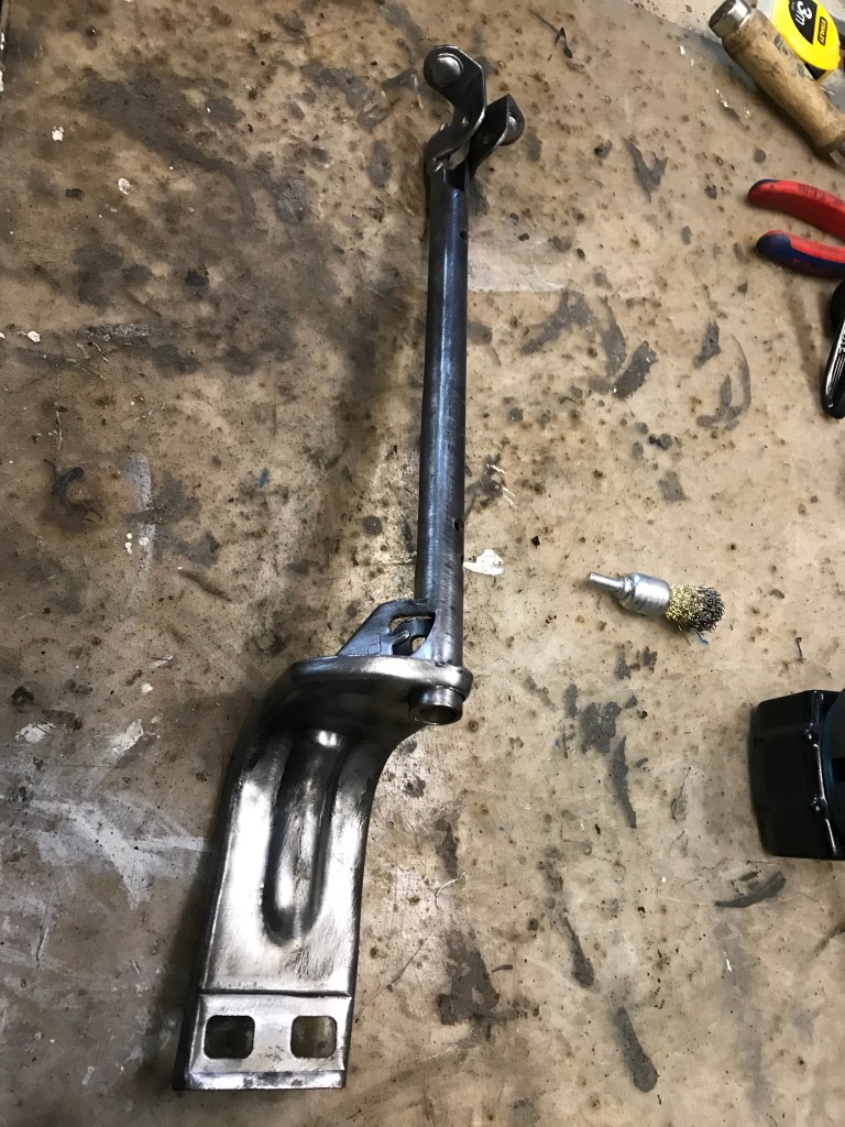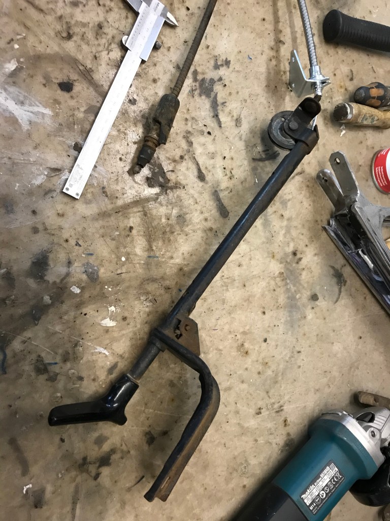 Also habe ich aufgrund mangelnder Kompatibilität drei Löcher in die Spritzwand gebohrt, und das „Gasgestänge“ schaut vom Motorraum her betrachtet so aus …
