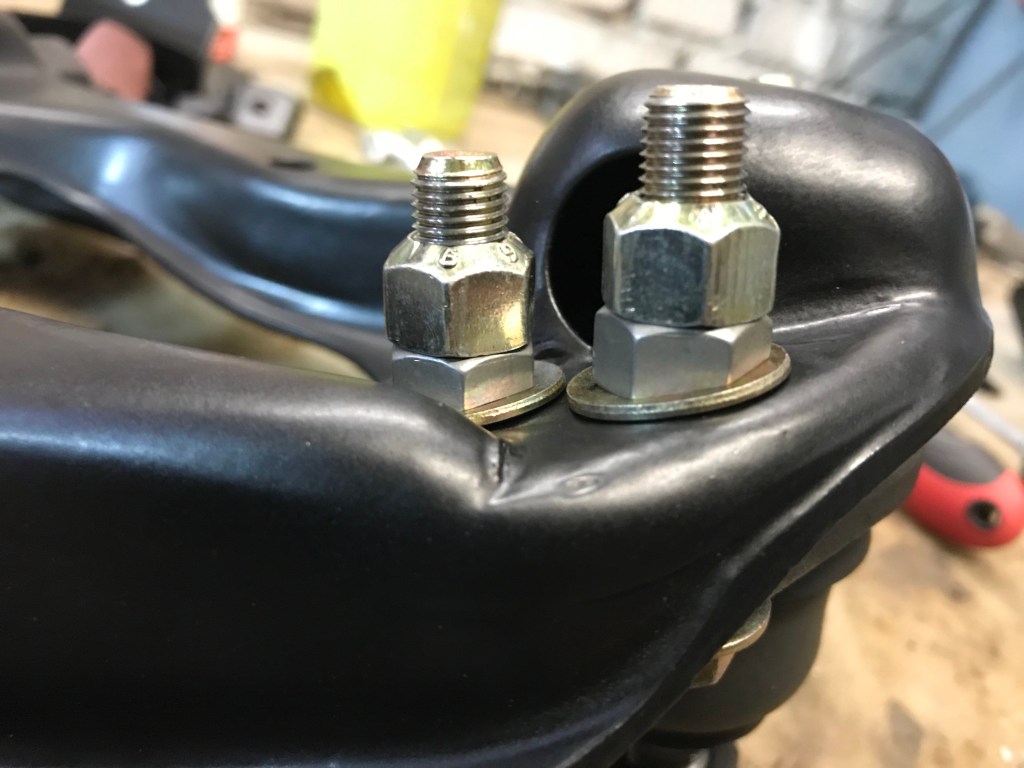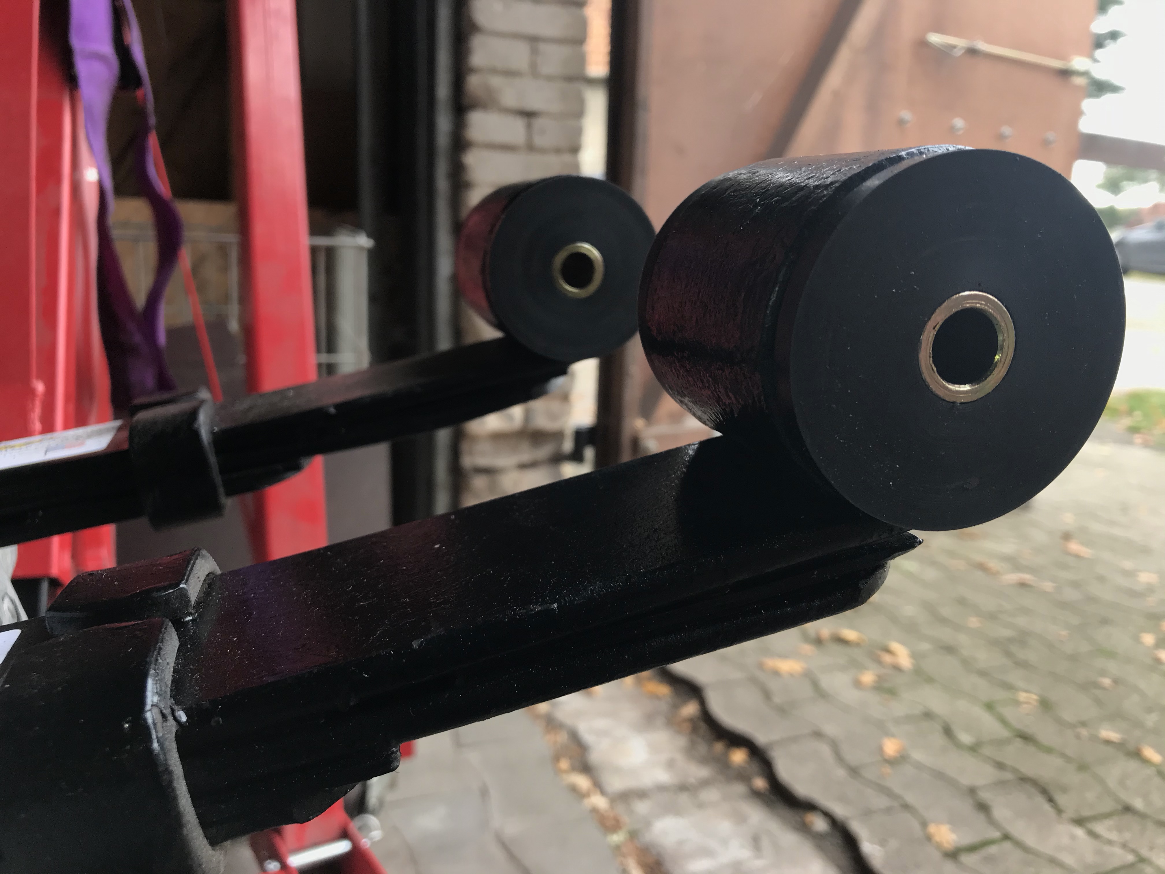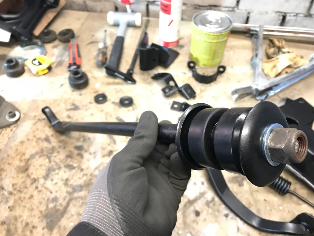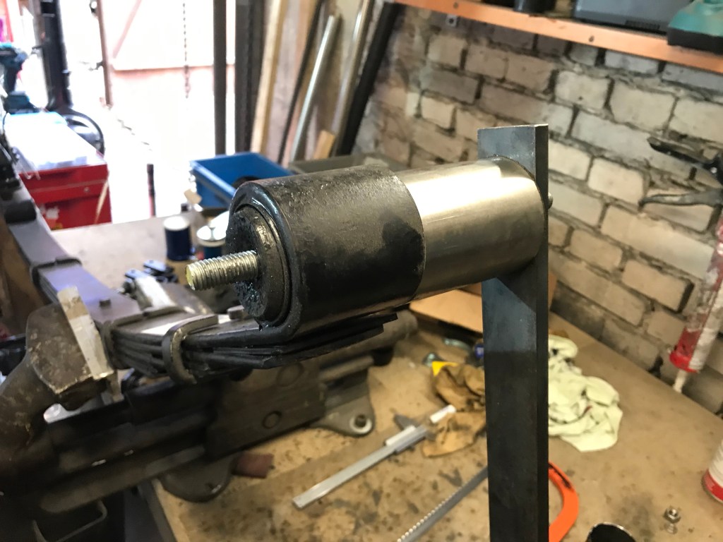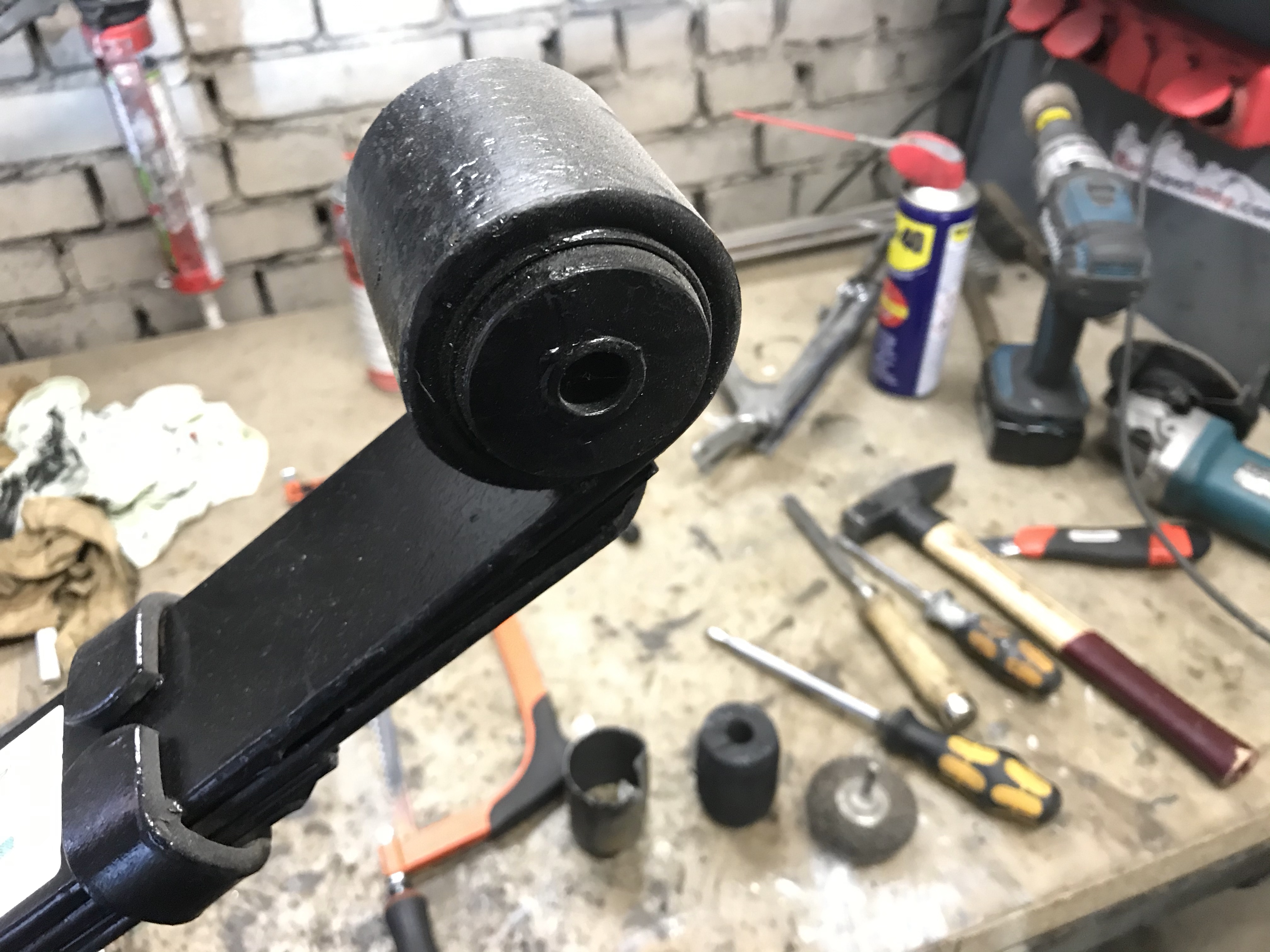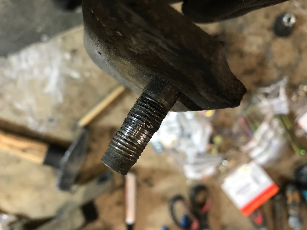 Um das Thema Vorderachse ein wirkliches weiteres Stück voranbringen, bot sich der rechte vordere Stoßdämpfer als willkommenes Objekt an. Die untere Lagerung auf dem oberen Querlenker ist in PU gemacht, während oben offenbar die Devise „Stahl auf Stahl“ lautet (immerhin ist das waagerechte Element in irgendetwas Nachgiebigem eingebaut):