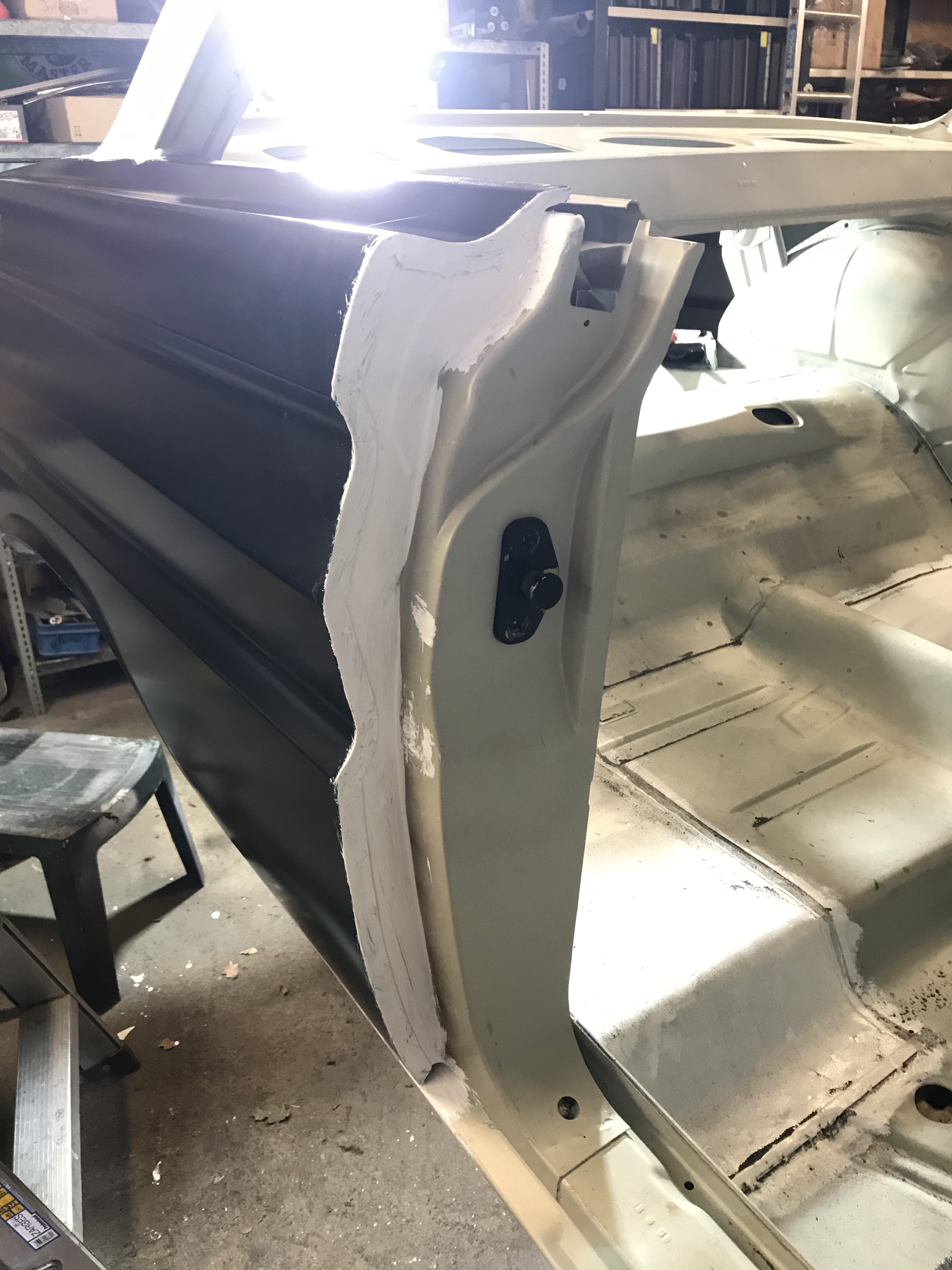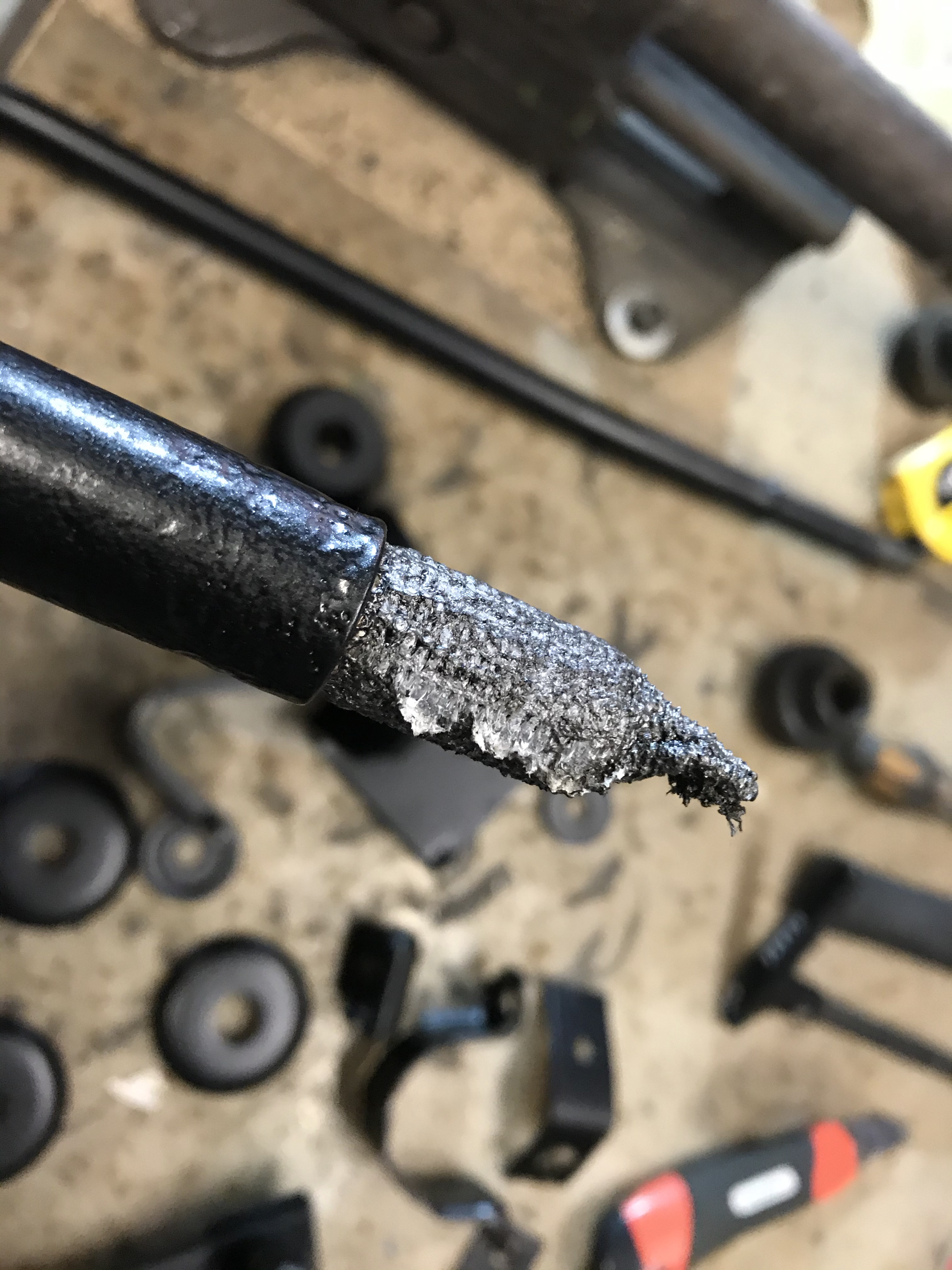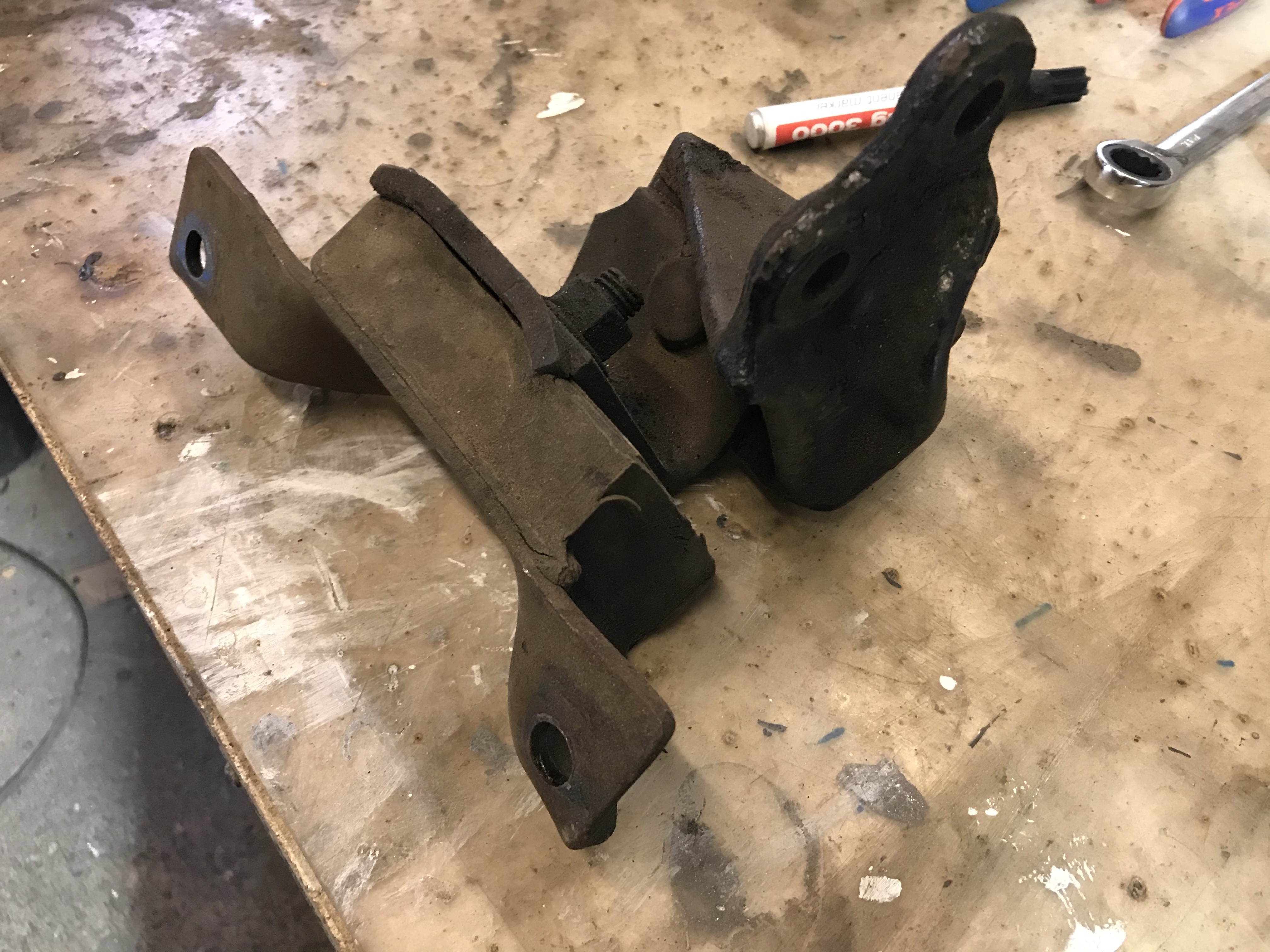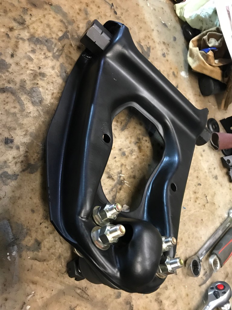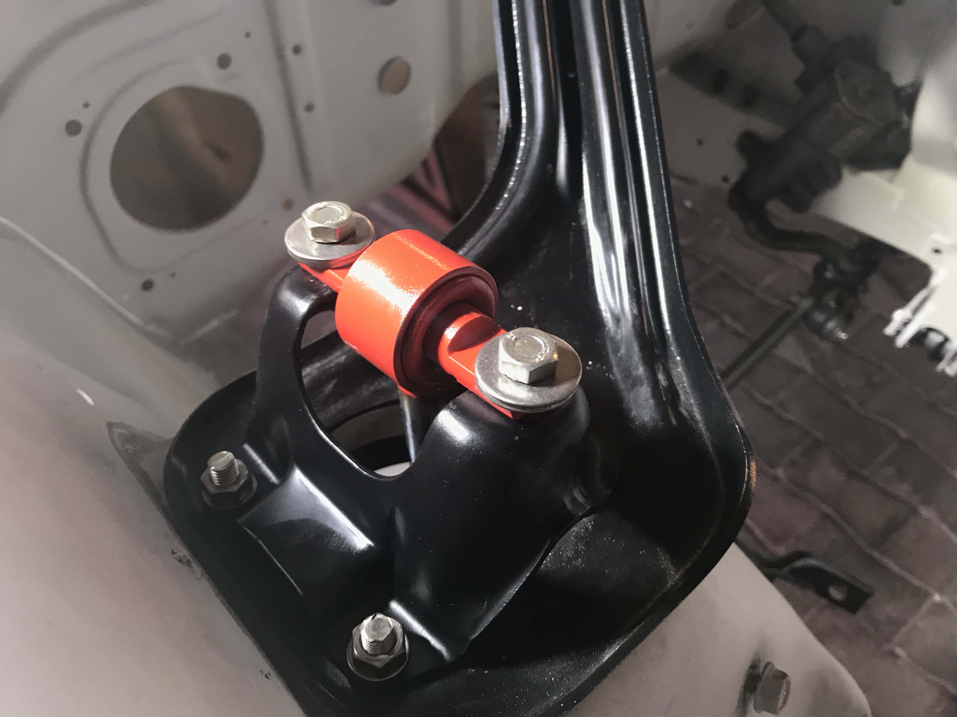 Um das Thema Vorderachse ein wirkliches weiteres Stück voranbringen, bot sich der rechte vordere Stoßdämpfer als willkommenes Objekt an. Die untere Lagerung auf dem oberen Querlenker ist in PU gemacht, während oben offenbar die Devise „Stahl auf Stahl“ lautet (immerhin ist das waagerechte Element in irgendetwas Nachgiebigem eingebaut):