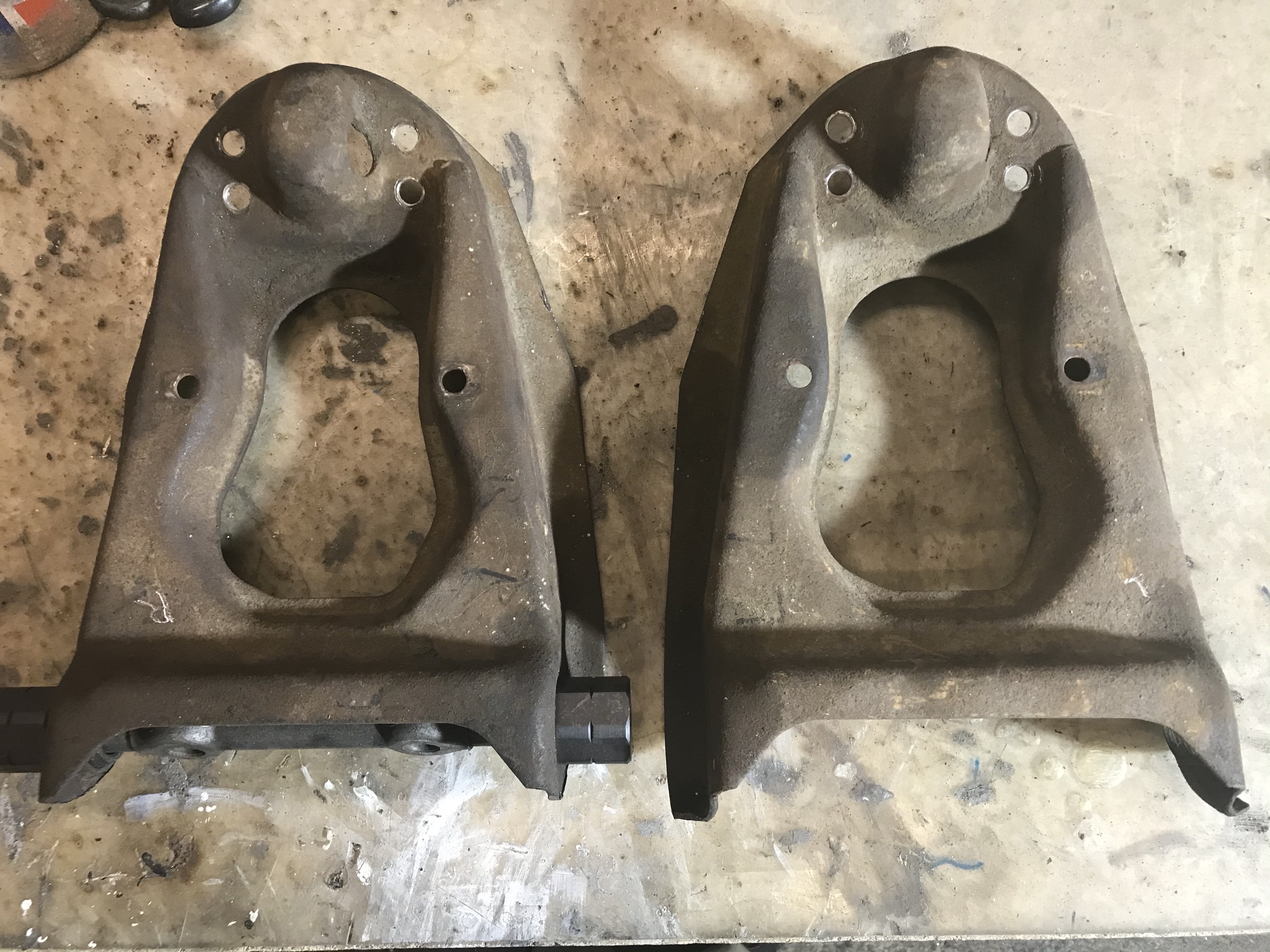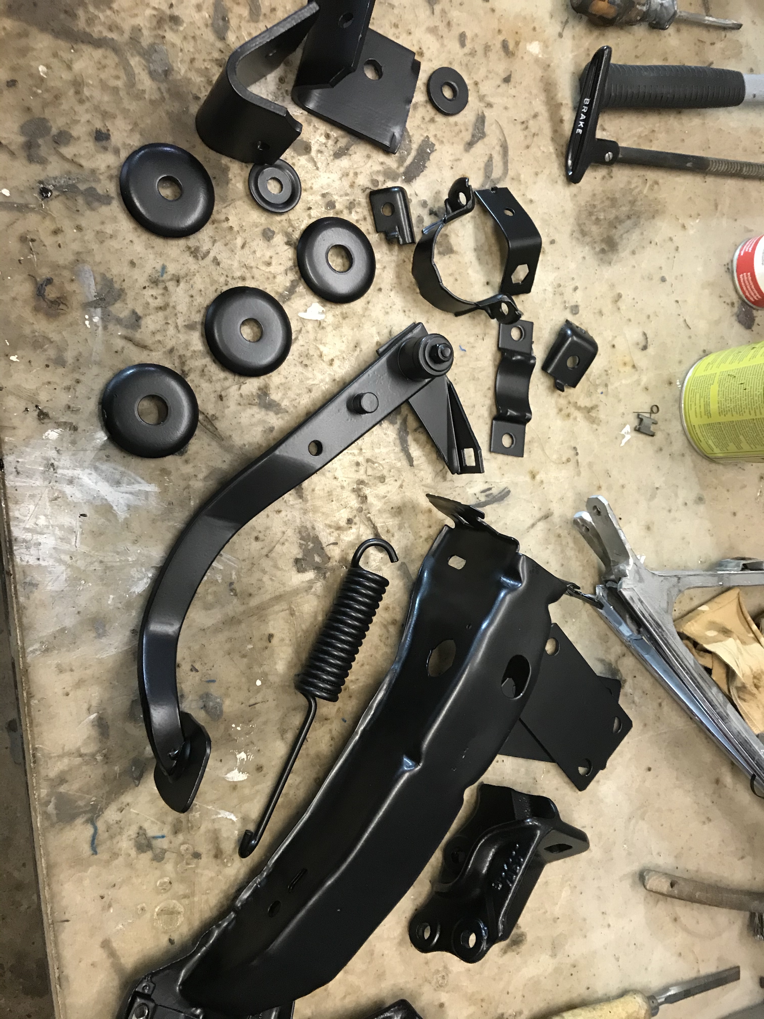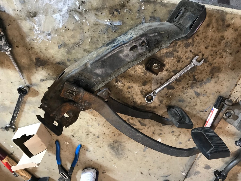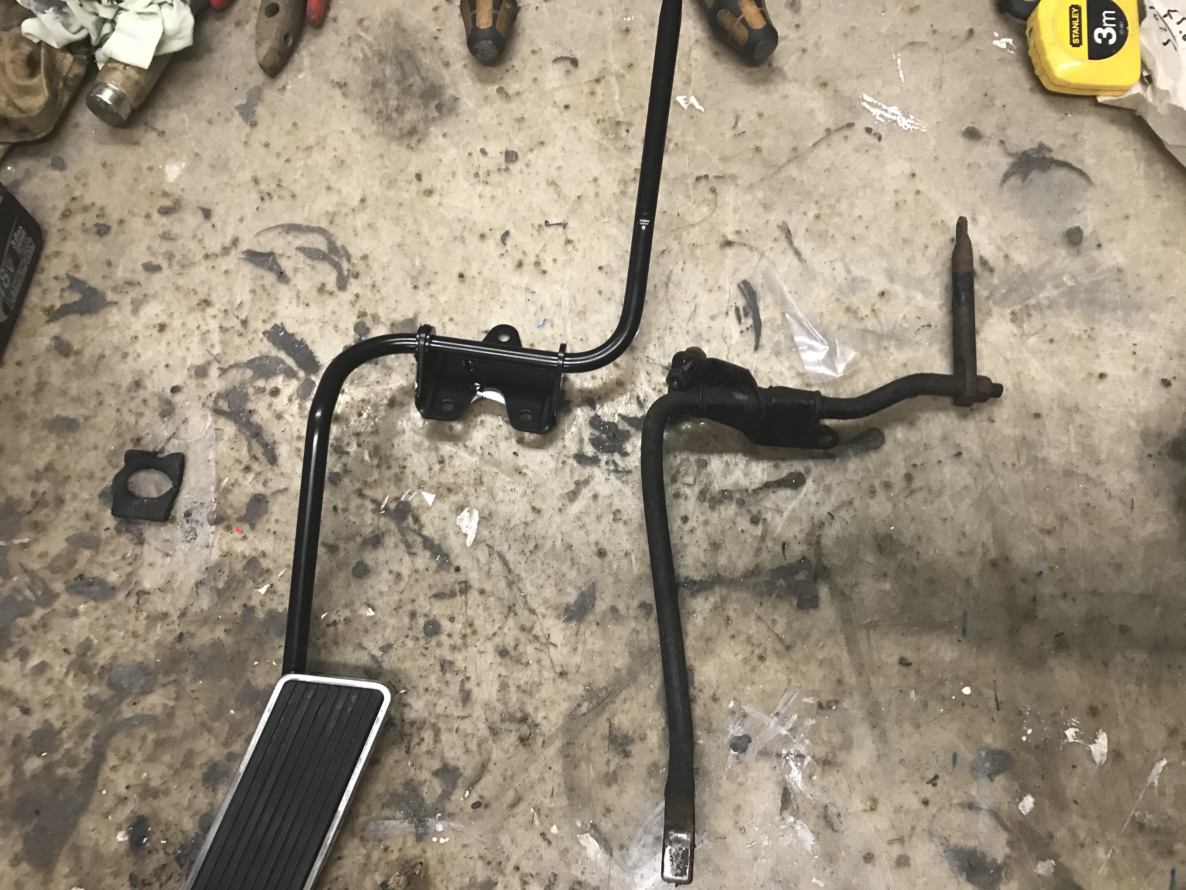 A pros pos Mustang: das im Falcon verbaute Folienpedal zur Betätigung des Vergasers wollte ich auf alle Fälle gegen etwas anderes ersetzen, und da lagen Mustangteile wiederum nahe. Im Bild links Marke Mustang, das Originalteil ist rechts erkennbar. Der Drehmechanismus im Falconteil ist nicht demontierbar, und nach mehr als 50 Jahren leicht schwergängig, oder besser: schwer schwergängig.