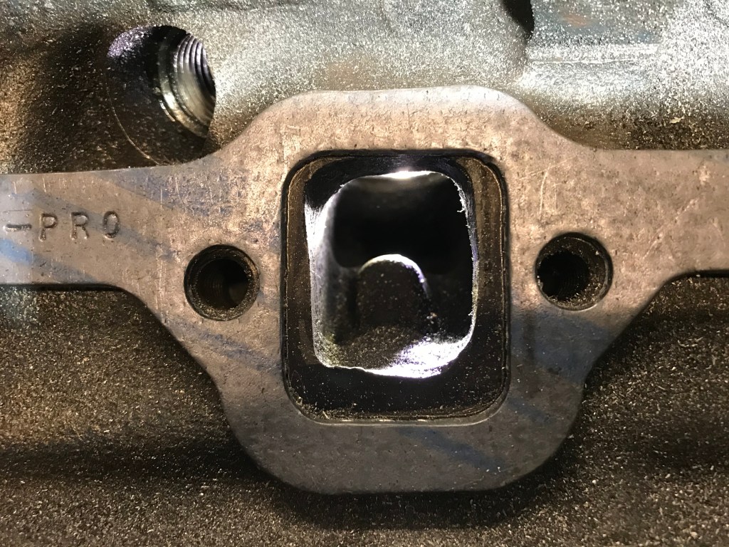 Welche Art der Gusstechnologie hier Anwendung fand, weiss ich nicht, jedenfalls ist jeder Auslass ein Unikat. Aus irgendwelchen Abgasgründen wurde ein Großteil des Auslasses noch durch ein konvexes Etwas, in der Bildmitte sichtbar, blockiert. Dass dieses Ensemble einer ungestörten Leistungsentfaltung deutlichst entgegenwirkt, ist einsichtig und macht die Arbeitsaufgabe sehr klar. Mit Hartmetallfräser im Geradschleifer und nach einiger Bearbeitungszeit ergab sich dann dieses optimierte Bild: