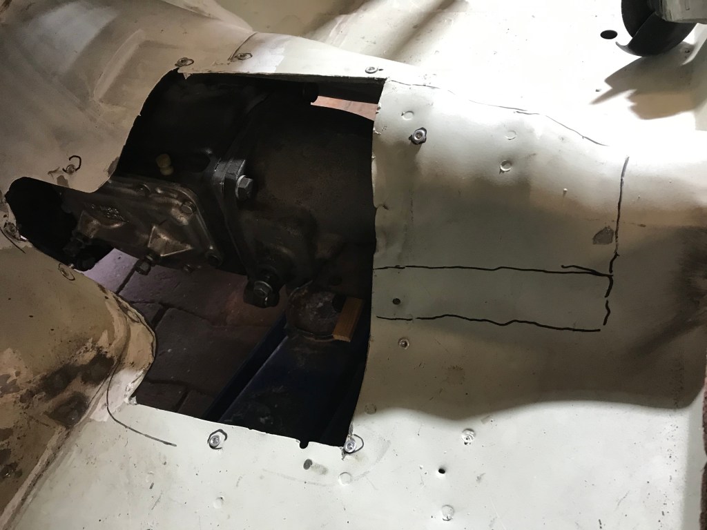 Nach ausgiebiger Inspektion des Antriebsstranges mit besonderer Würdigung der Kollisionsgefahr mit der Karosserie war leicht erkennbar, dass mindestens der nachfolgend gekennzeichnete Bereich des Tunnels zu entfernen wäre: