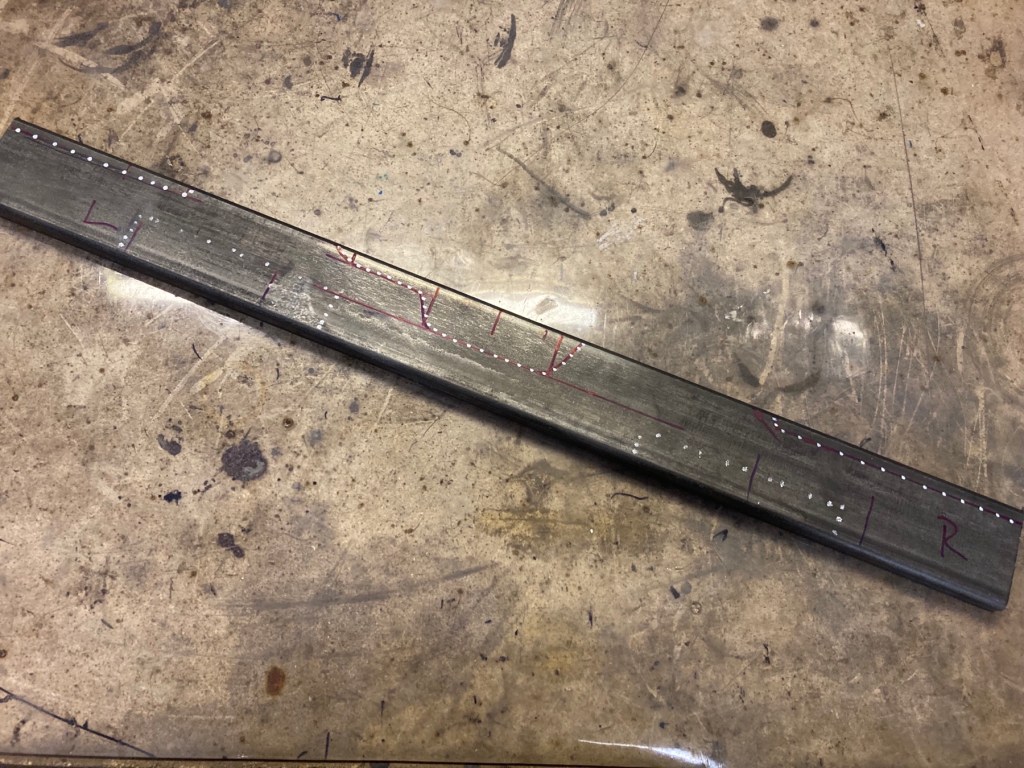 Zumindest räumlich ähnlich ist der Getriebequerträger angeordnet. Hier habe ich ein Rechteckrohr 60x20x3 erstanden, und schon einmal grob die Zielkontur ermittelt: