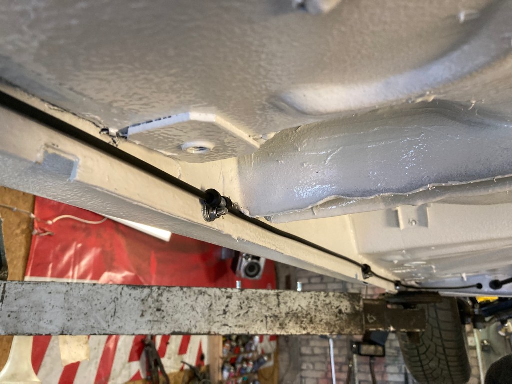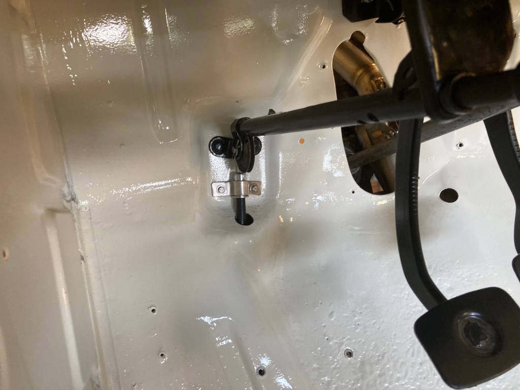 Im Fahrzeuginneren fehlte noch dieser Halter aus Metall (?), der die Bowdenzughülle der Handbremse fixiert: