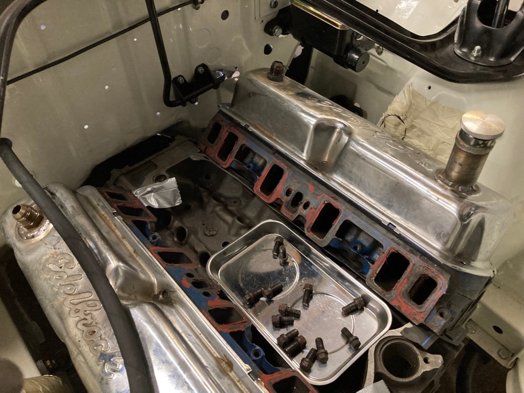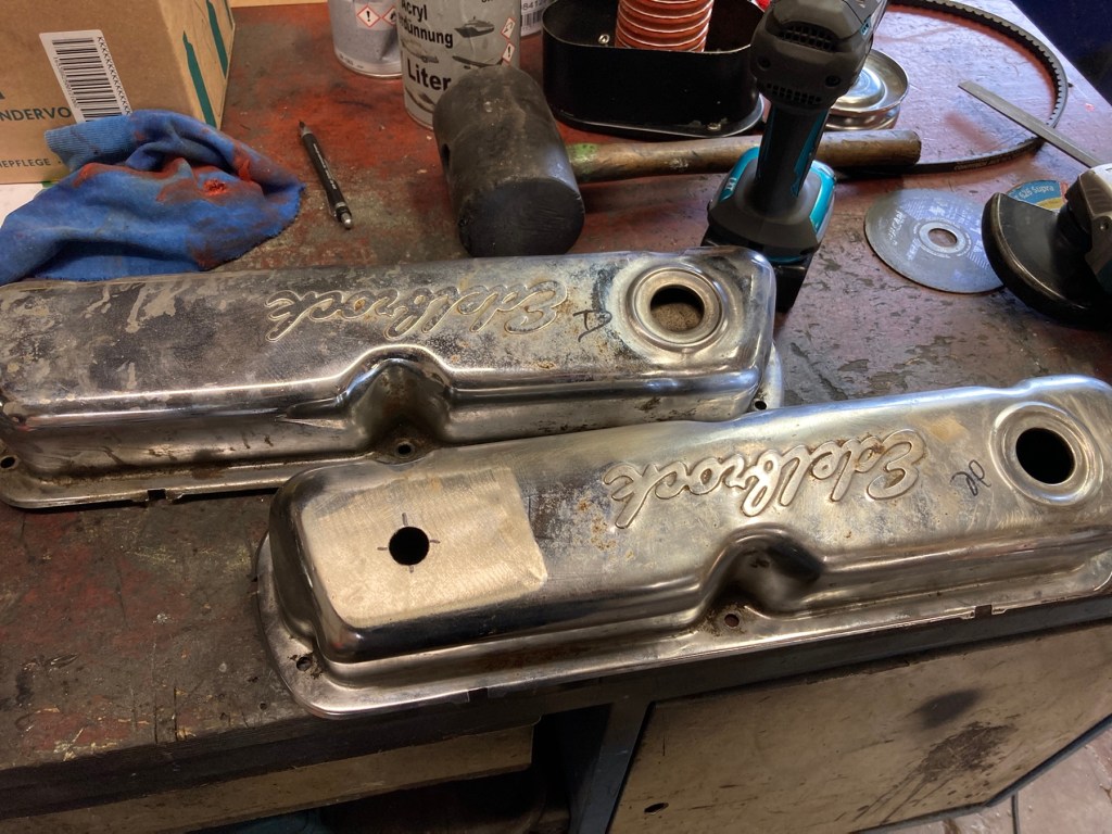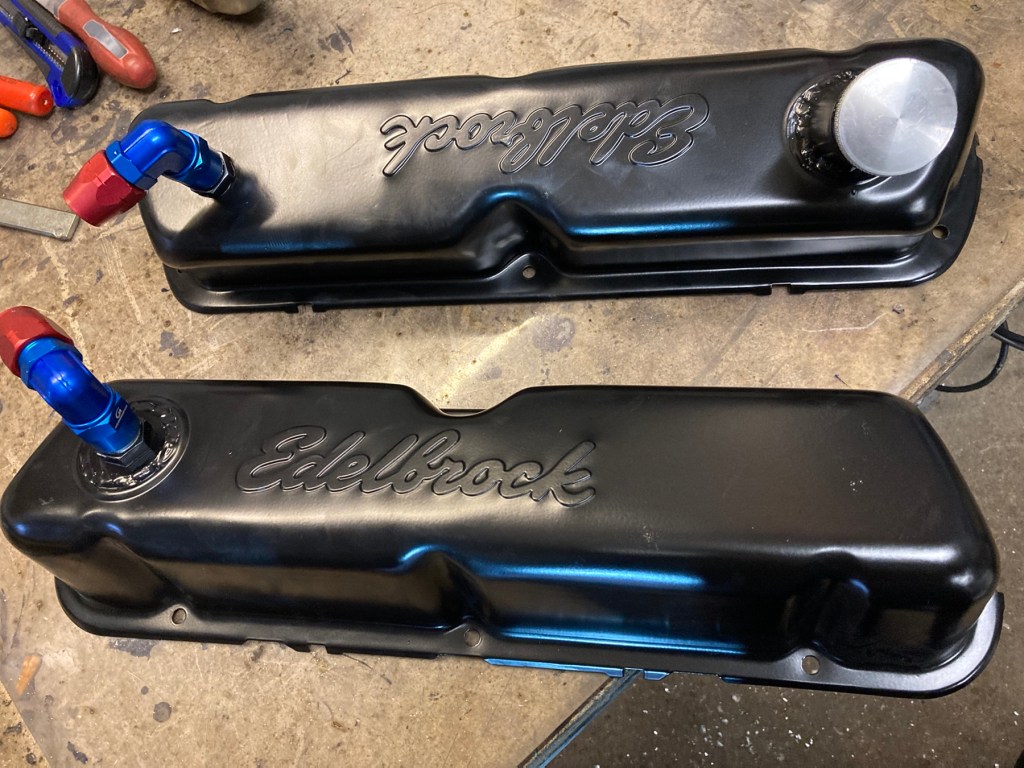 Die edelbrockgeprägten Ventildeckel konnte ich nach erfolgreicher Pulverbeschichtung abholen, und habe sie gleich vormontiert: