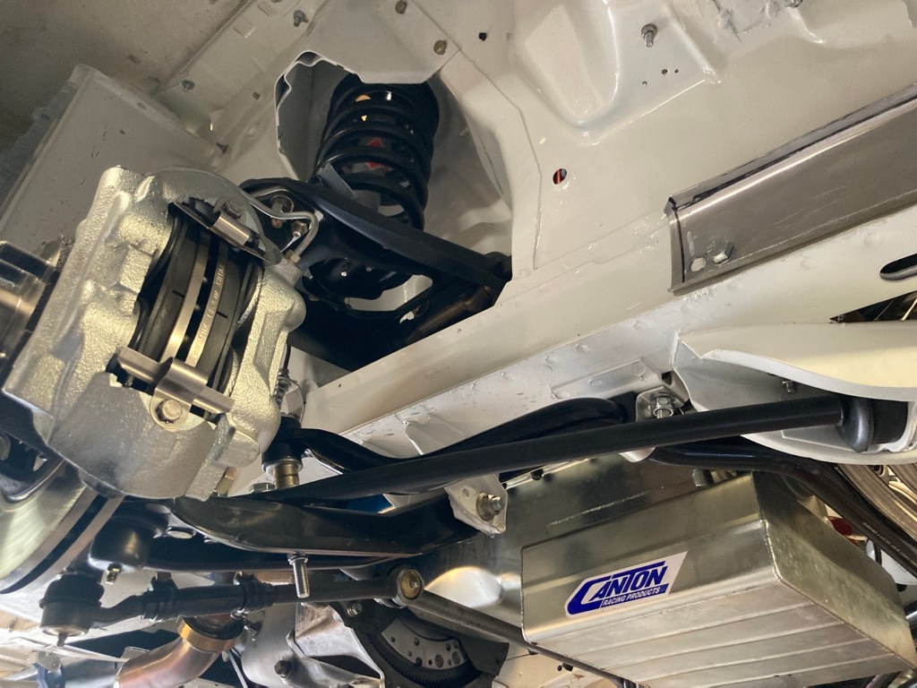 Beim Falcon stand immer noch die Abarbeitung der FIA-Liste mit den Dingen an, die nicht periodenspezifisch sind, oder sein sollen. Die Vorderachse samt Vollstabilisator und Shocks ist montiert:
