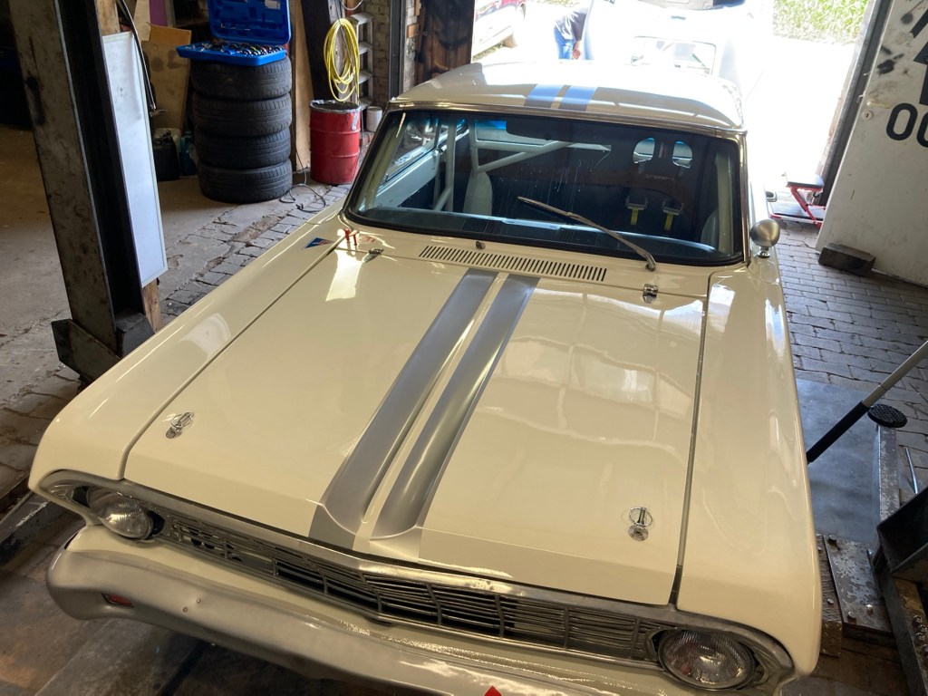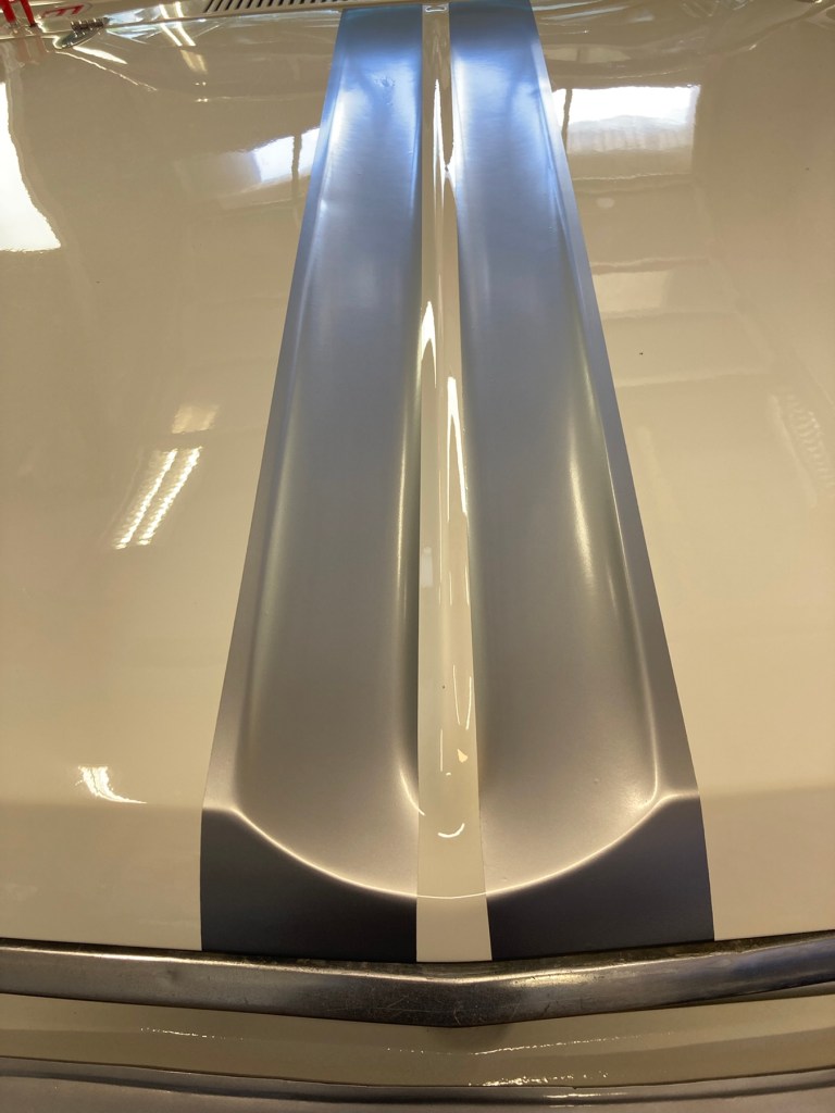 Der Reihe nach: um den Falcon für die beiden Trackdays am kommenden Wochenende startkar zu machen, stand erst einmal eine Wagenwäsche statt. Auf Fotos habe ich aus naheliegenden Gründen verzichtet. Die Wäsche hatte auch den Grund, die Oberflächen von Dach und Motorhaube für die Beklebung mit den restlichen silberfarbenen Streifen zu reinigen, und später mit Isopropanol behandelt richtig sauber zu haben. N hatte die gewagte Idee, die zu beklebenden Oberflächen mit Seifenlauge zu fluten, und dann die Klebestreifen quasi schwimmend zu applizieren. Ich bin grundsätzlich positiv und Neuem gegenüber offen eingestellt, also warum nicht.