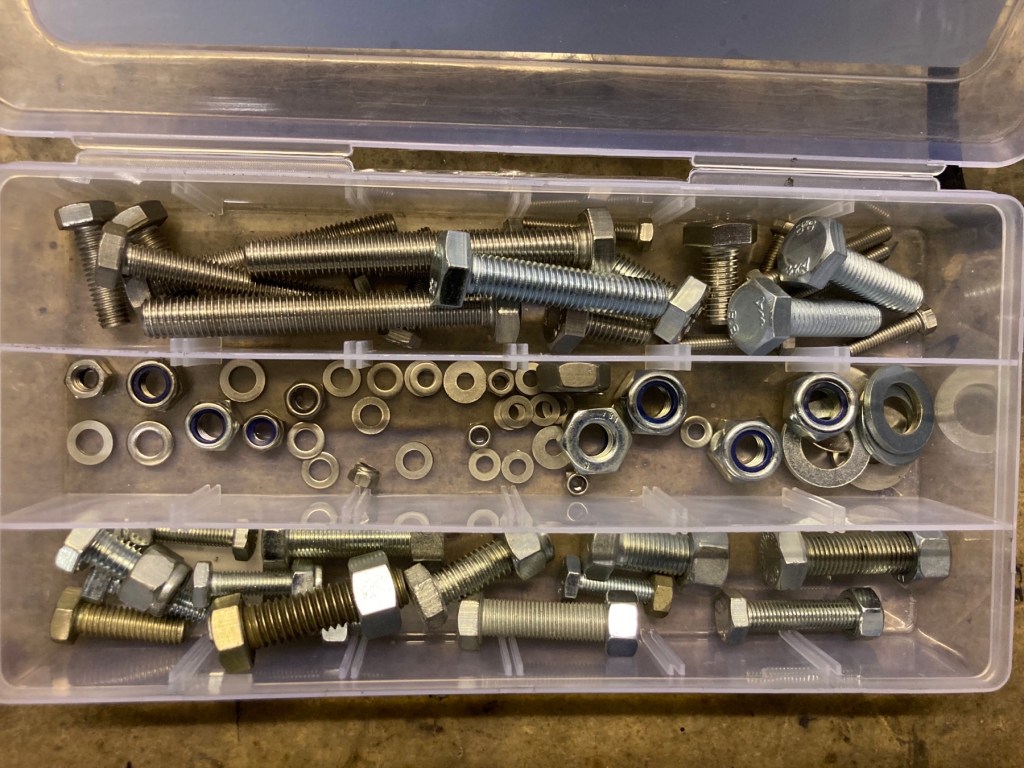 Final am heutigen build day ist dann noch, aus Erfahrung, diese Sammlung von Schrauben, Muttern und Scheiben entstanden, metrisch und zöllig, UNF und UNC, die track day Grundausstattung werden werden: