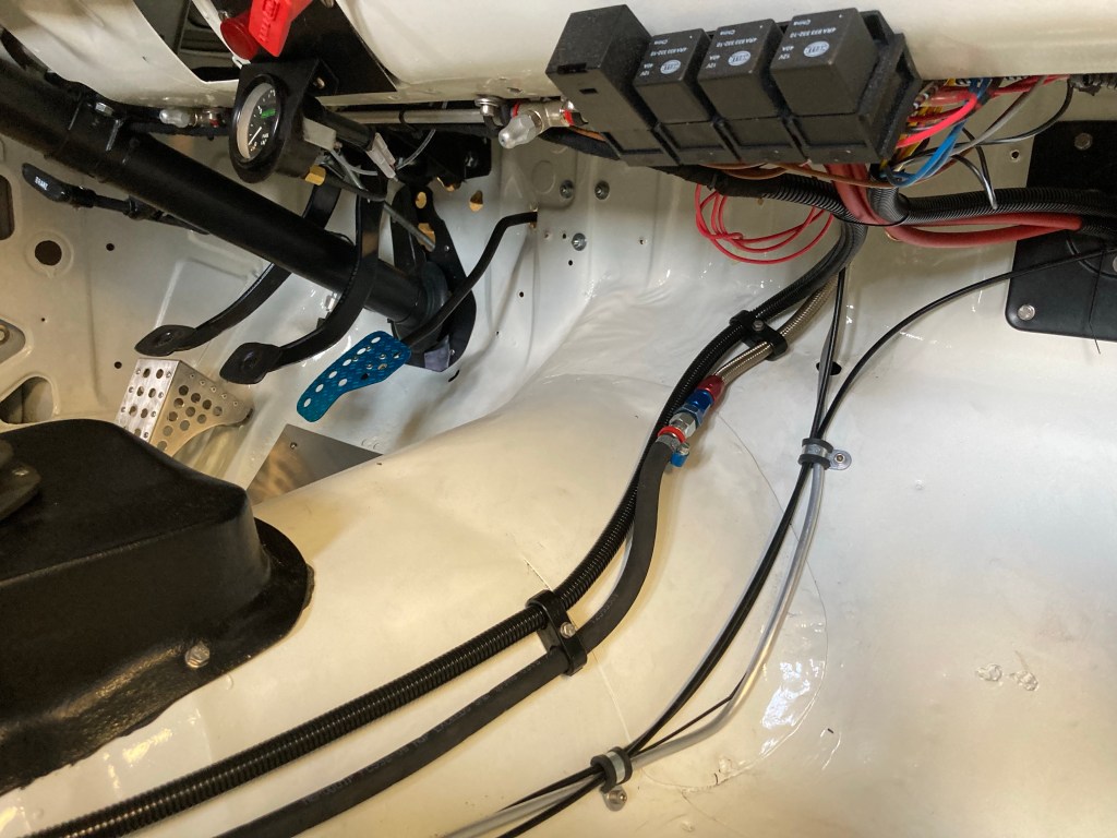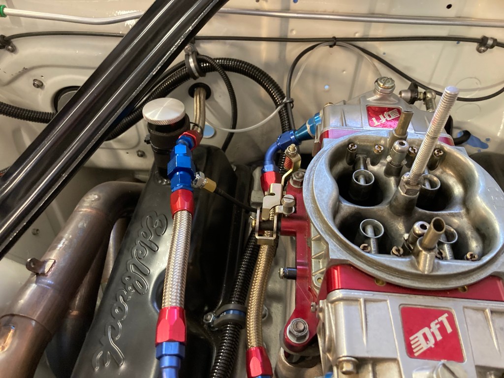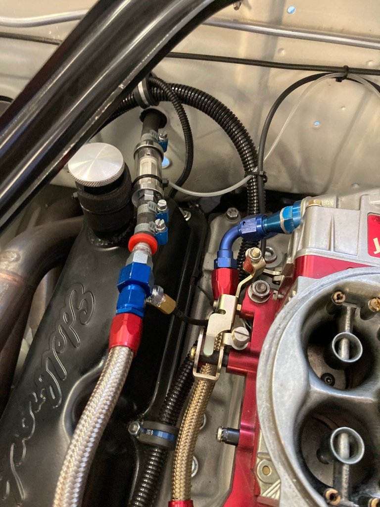 Hier noch ein Foto von der neuen Schnittstelle zwischen Aeroquipgummischlauch und Dash6 Stahlflex in der Kraftstoffleitung: