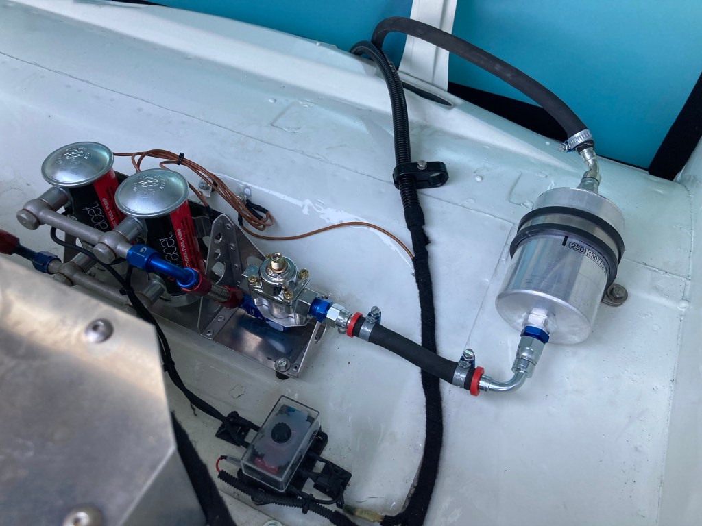 Als das dann gegen Mittag erledigt war, stand die Verlegung des Kraftstoffilters in Richtung des Wagenendes an. So sah es bislang aus, der zu kleine Filter über dem Krümmer, irgendwie ungünstig: