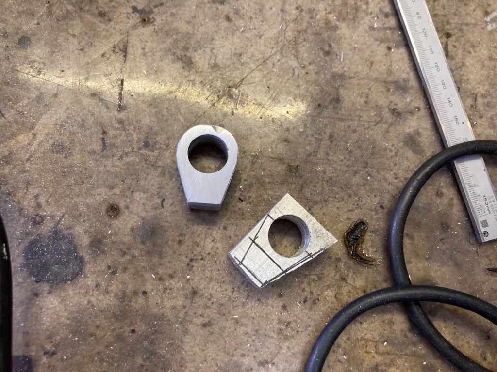 Meine im letzten log verworfenen Befestigungen für den Wasserkühler oben habe ich bravurös aus einer fünfzehn Millimeter dicken Aluminiumplatte, die noch zufällig im Regal lag (Messi, Messi), herausgearbeitet: